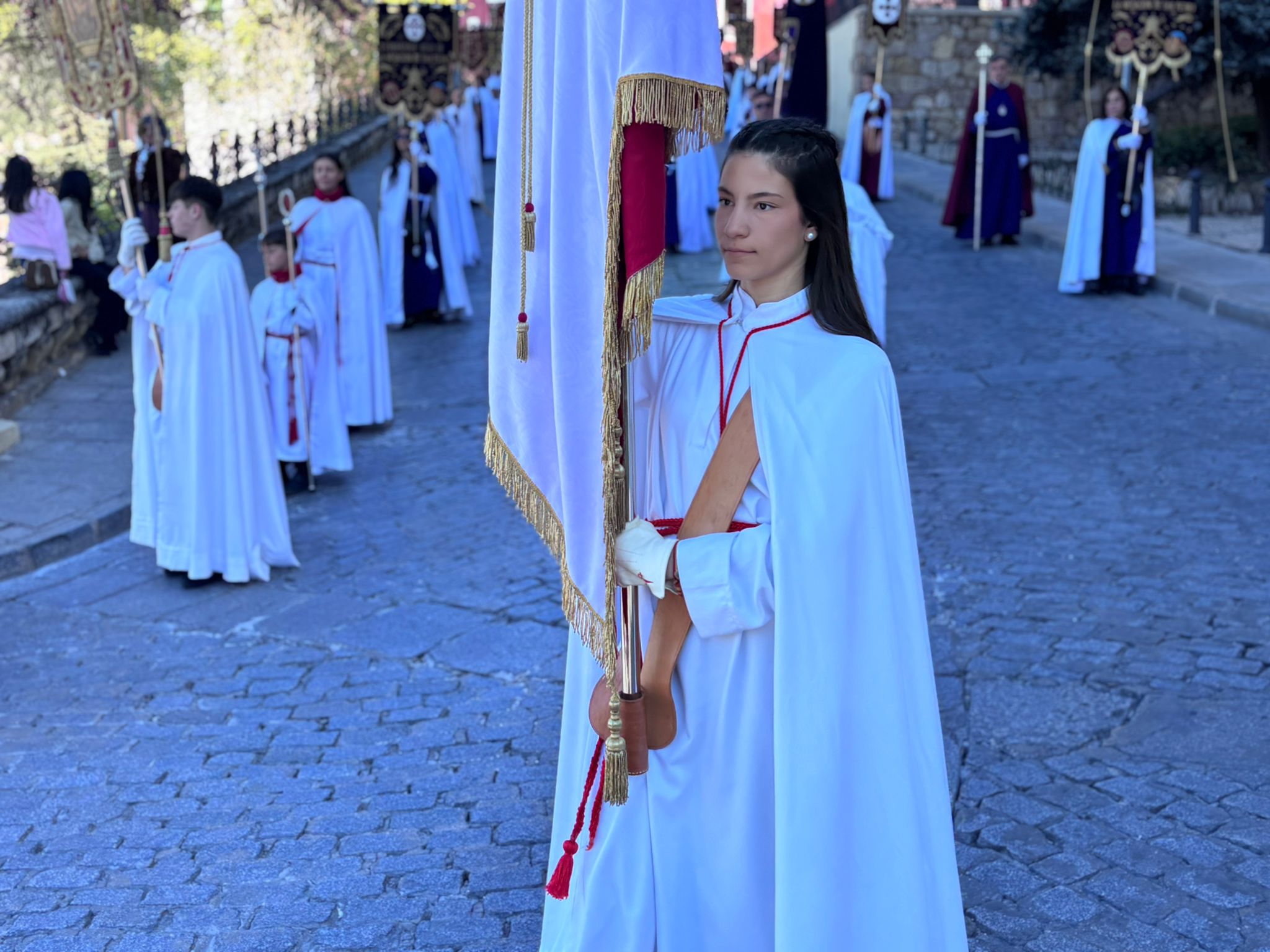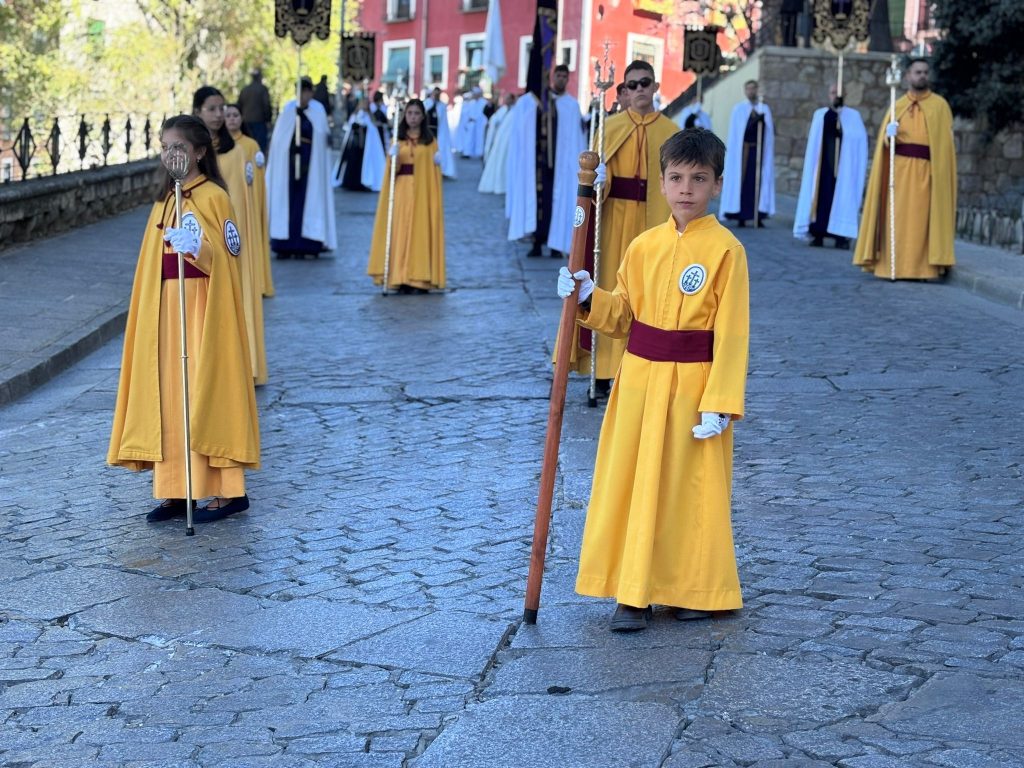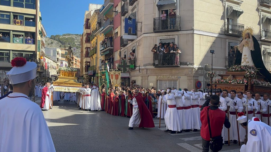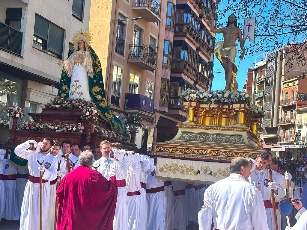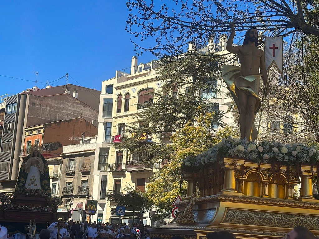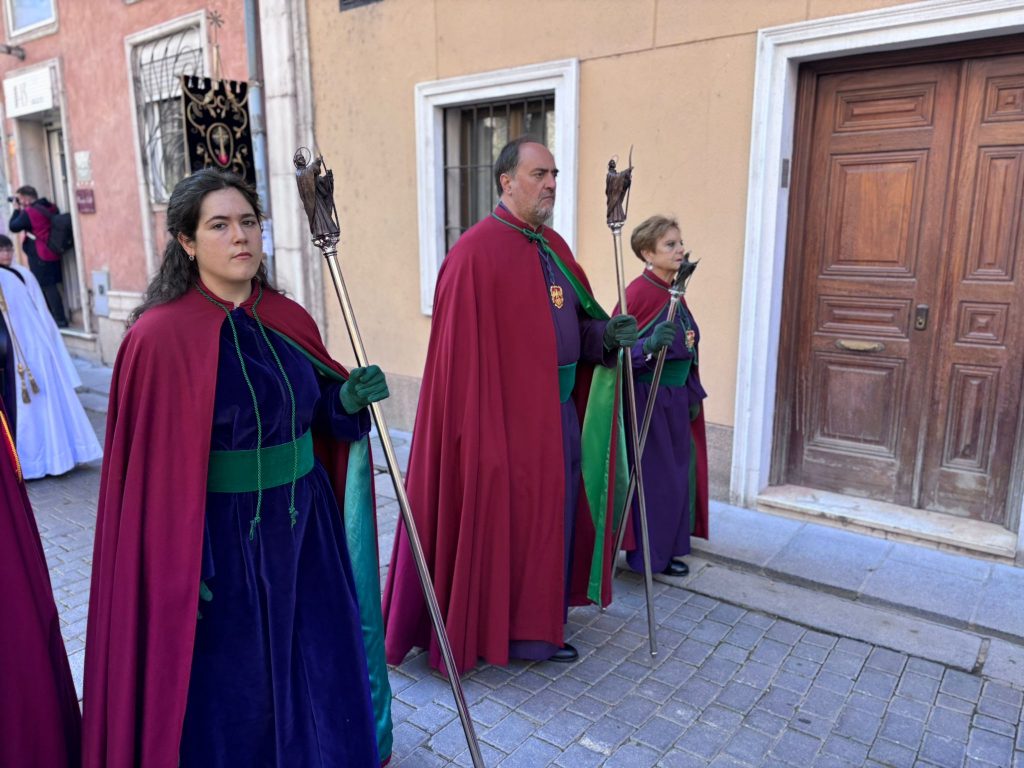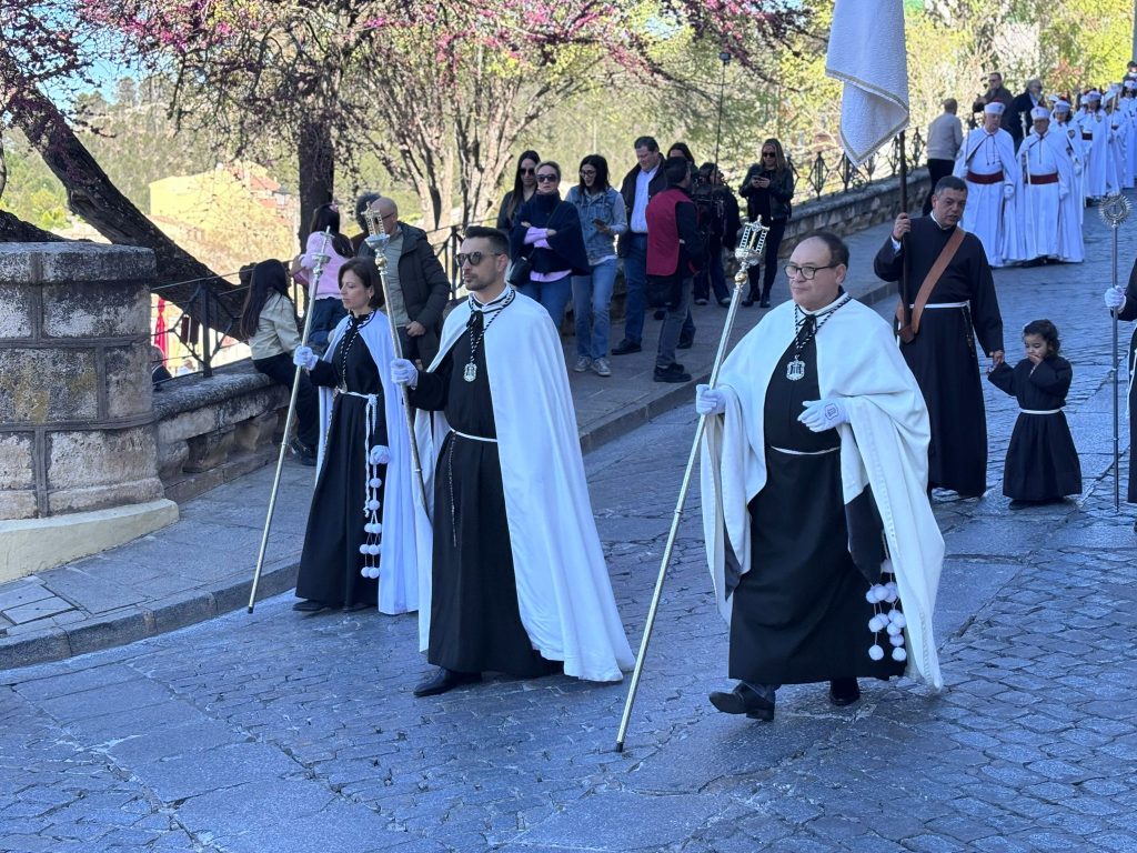 Las Sagradas Imágenes eligen caminos distintos. El Resucitado avanza por calles amplias para empaparse de la luz y el aire que echaba en falta en el sepulcro. Sigue la estela de color que forman los representantes de las hermandades de Cuenca, reunidas por este gran acontecimiento.