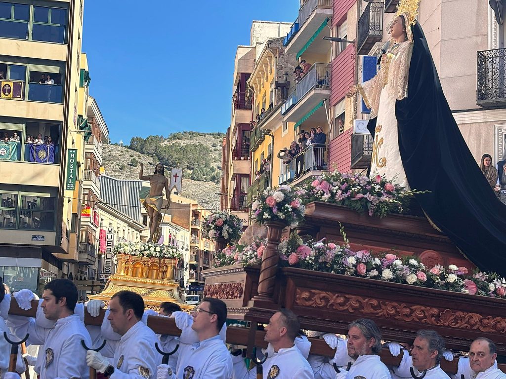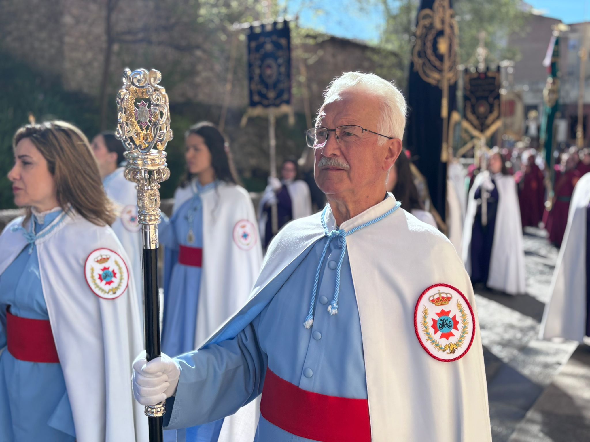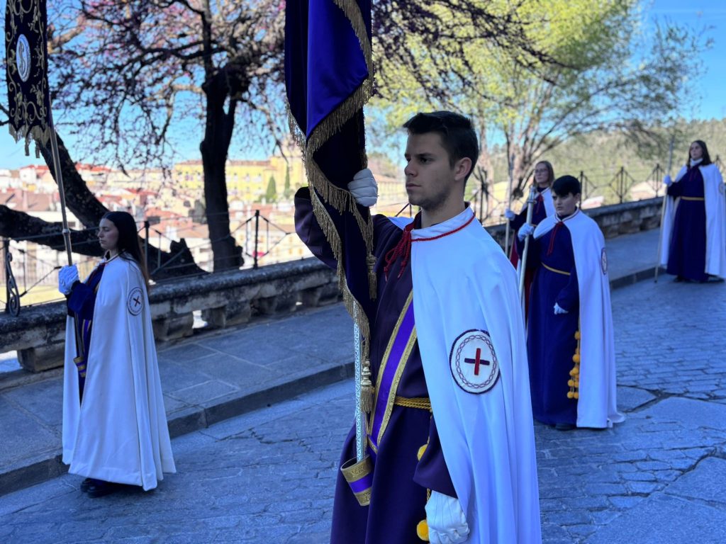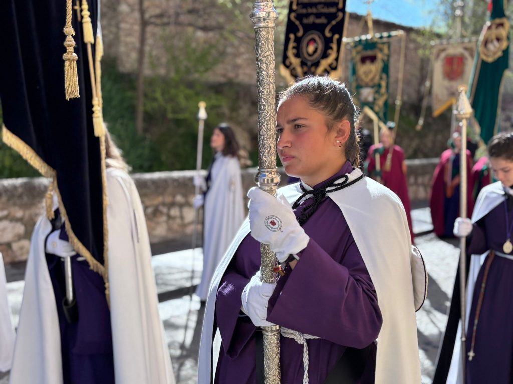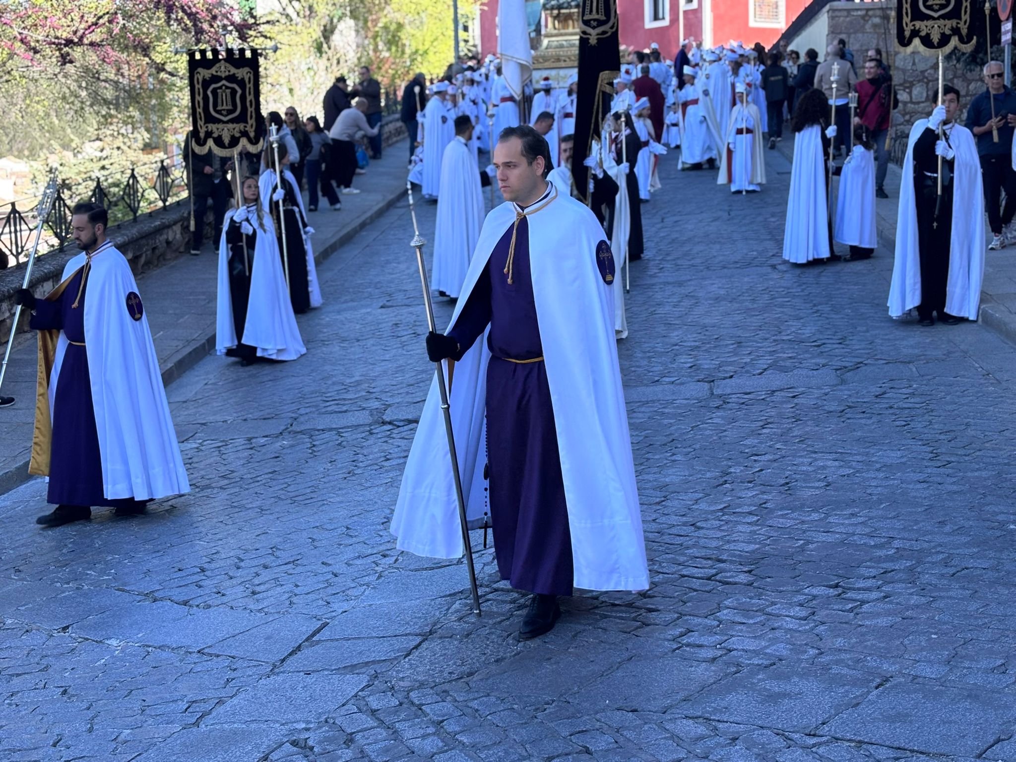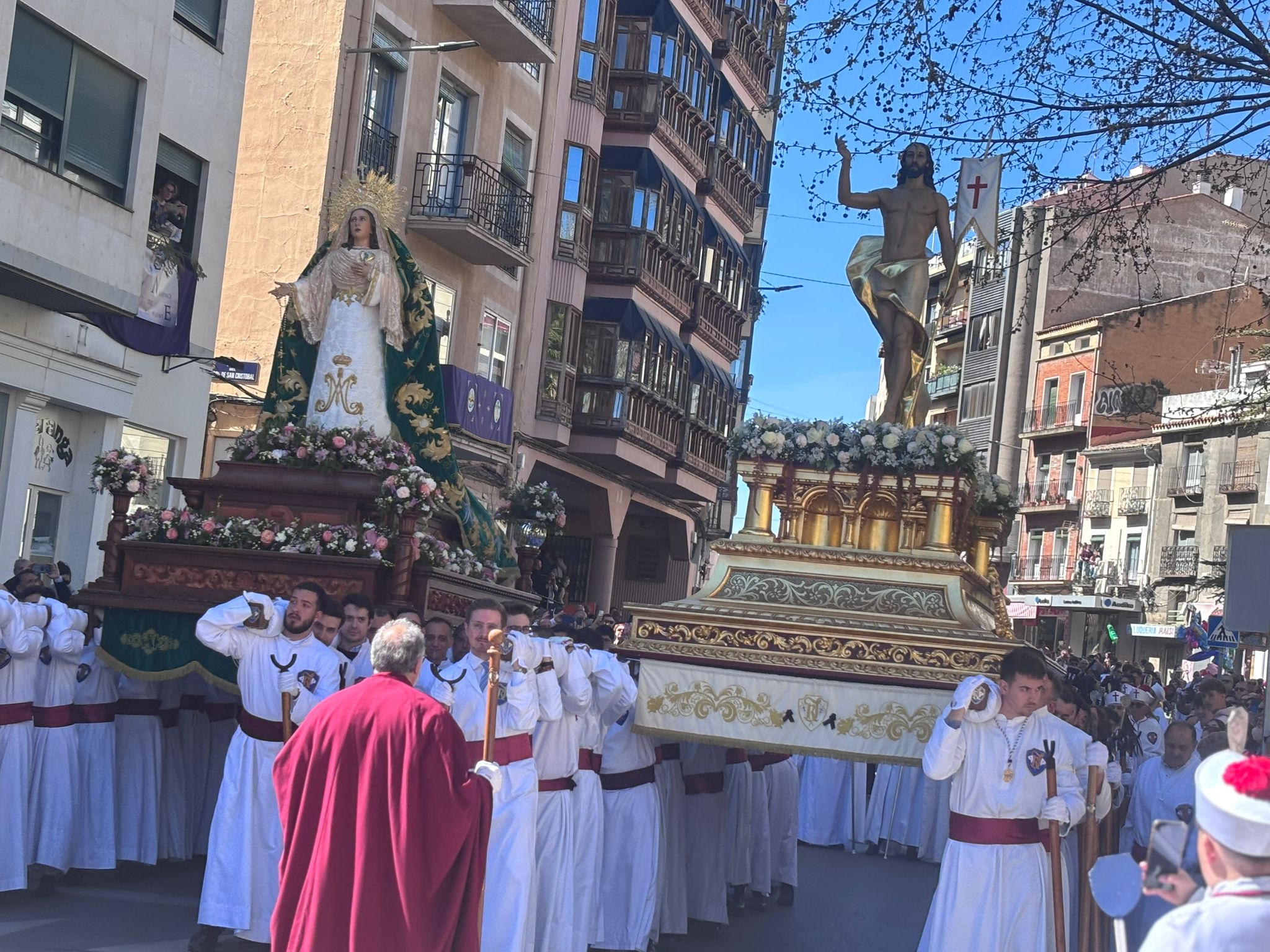 Las Sagradas Imágenes eligen caminos distintos. El Resucitado avanza por calles amplias para empaparse de la luz y el aire que echaba en falta en el sepulcro. Sigue la estela de color que forman los representantes de las hermandades de Cuenca, reunidas por este gran acontecimiento.
