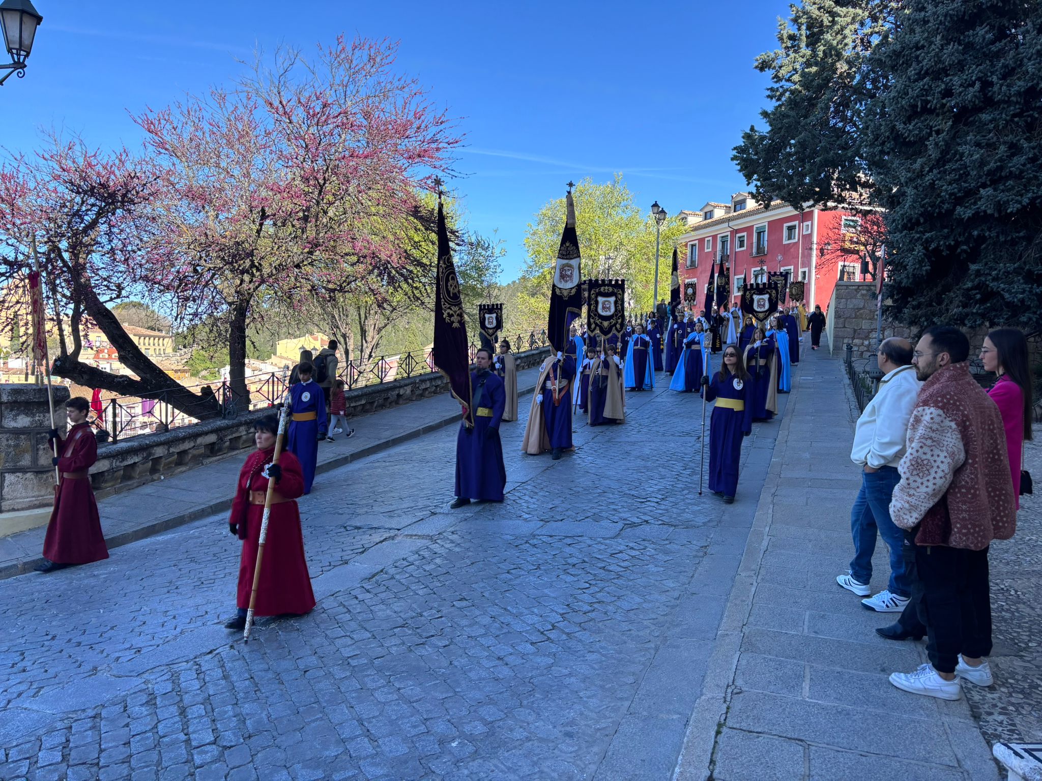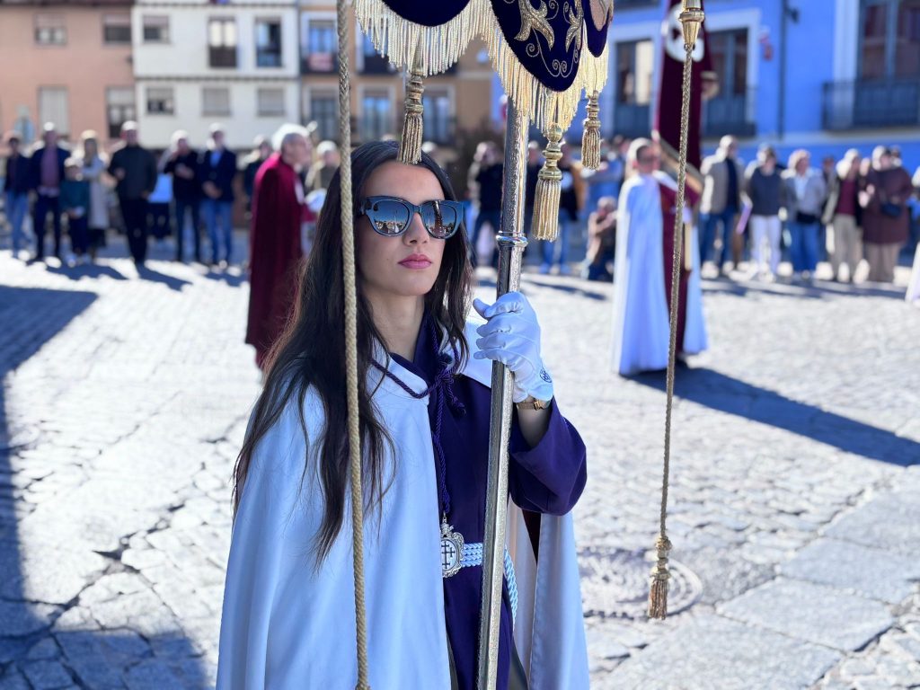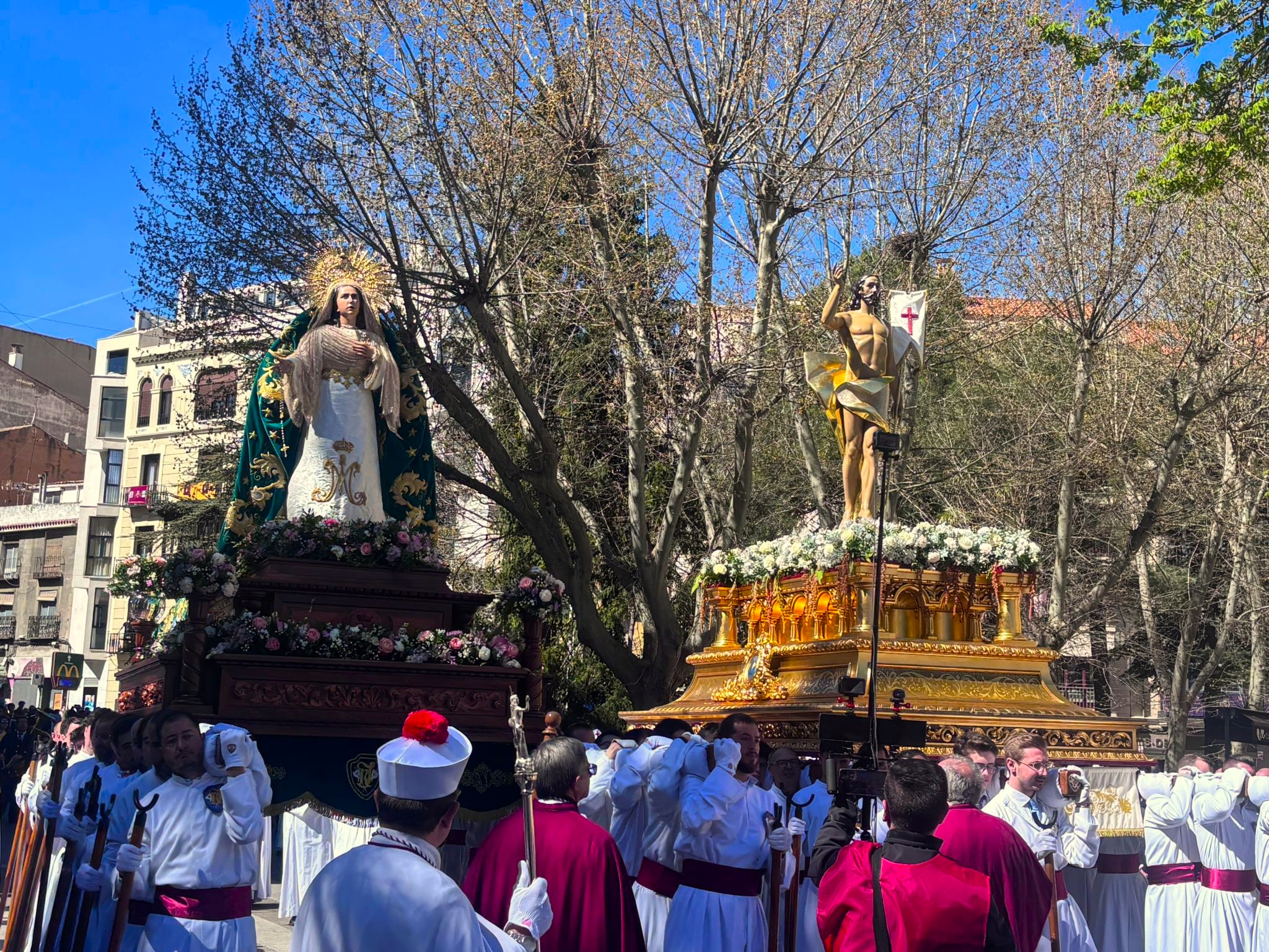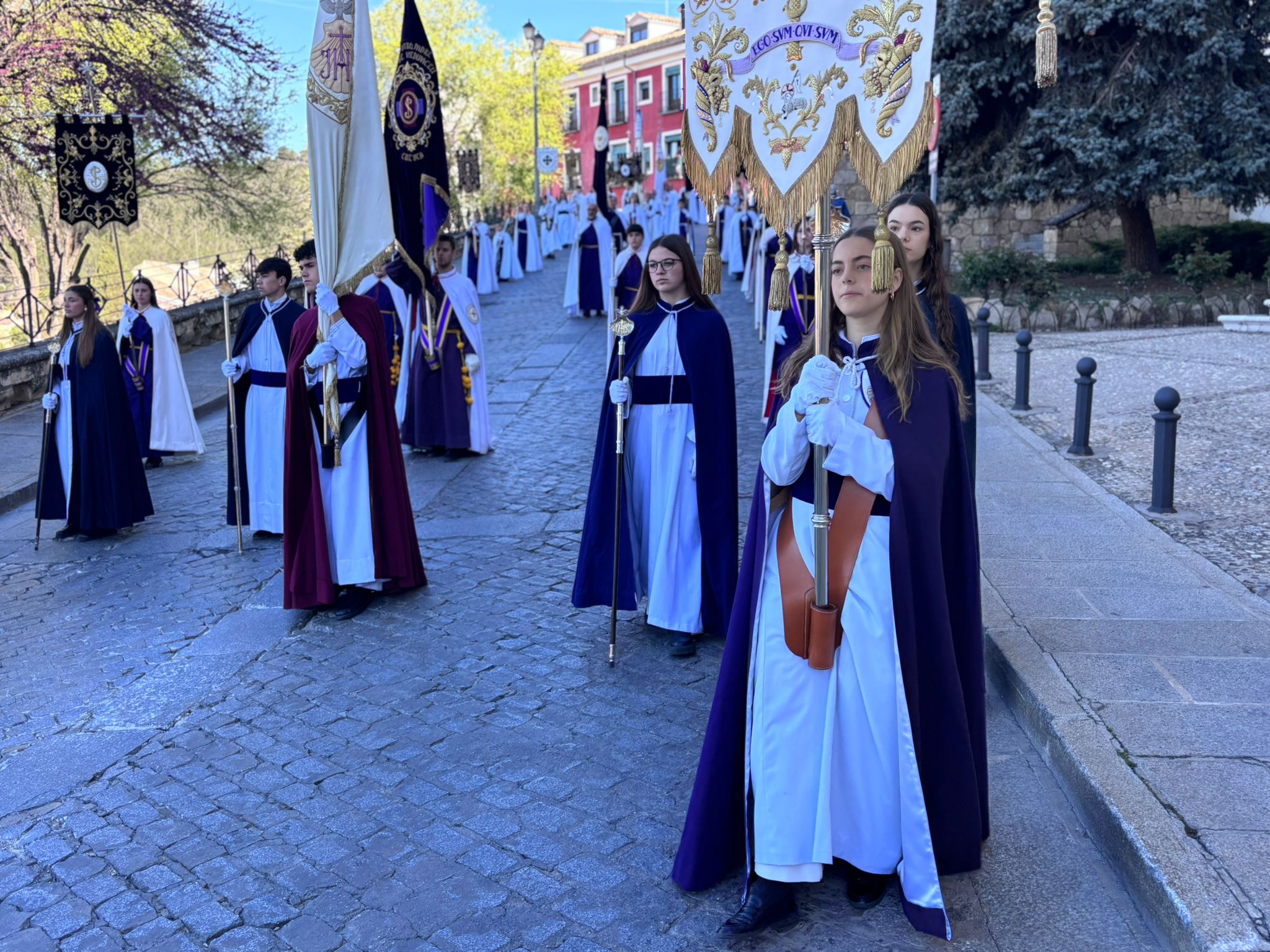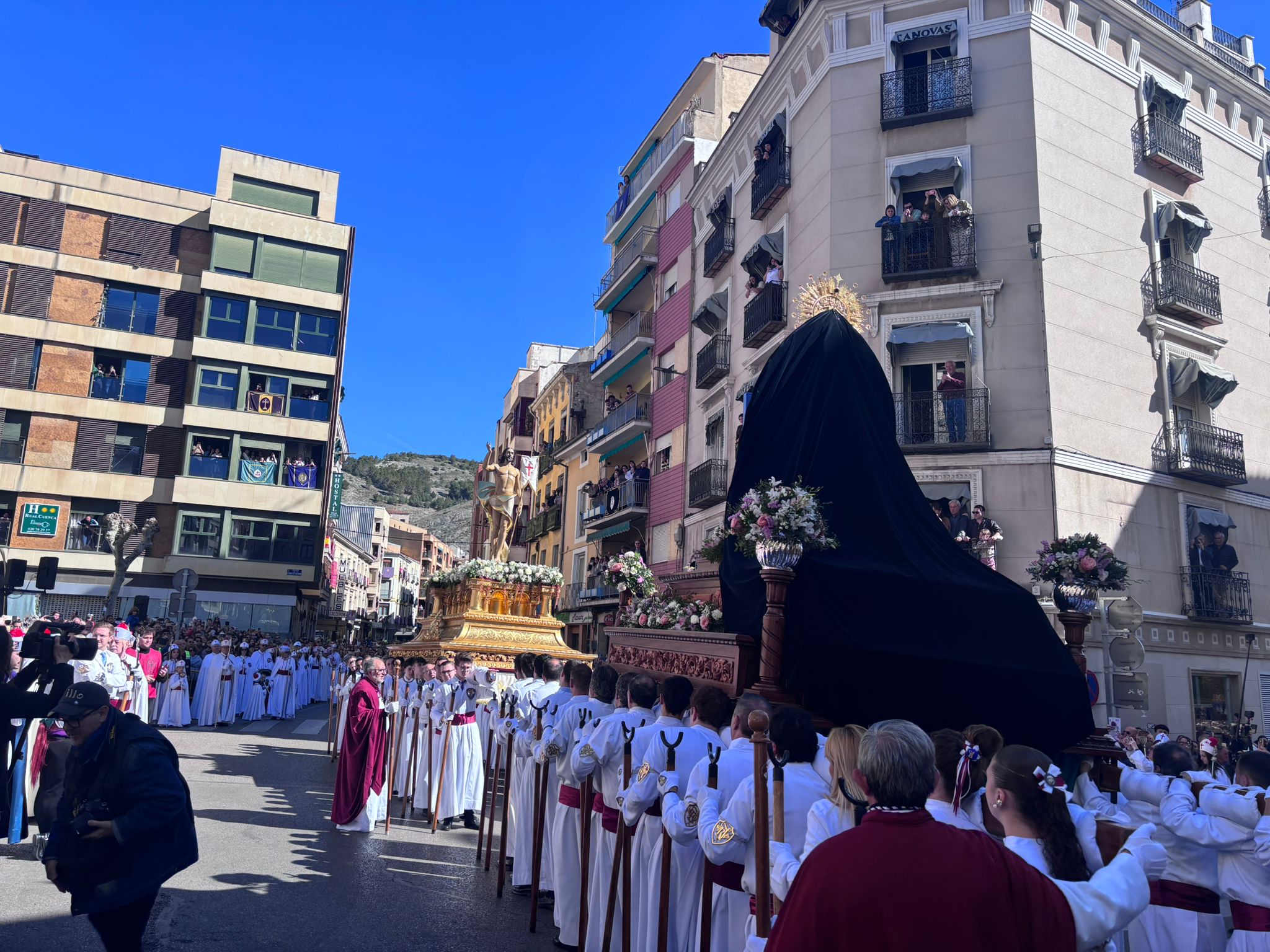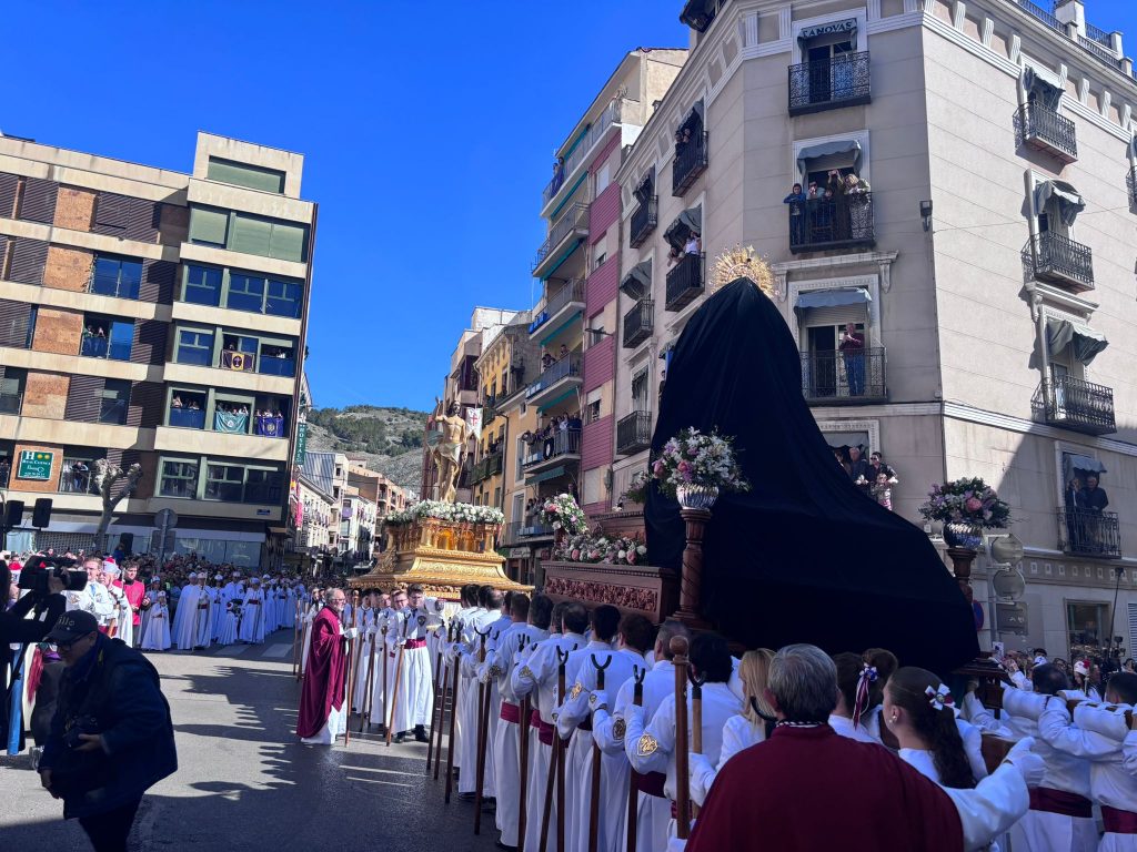 Las Sagradas Imágenes eligen caminos distintos. El Resucitado avanza por calles amplias para empaparse de la luz y el aire que echaba en falta en el sepulcro. Sigue la estela de color que forman los representantes de las hermandades de Cuenca, reunidas por este gran acontecimiento.