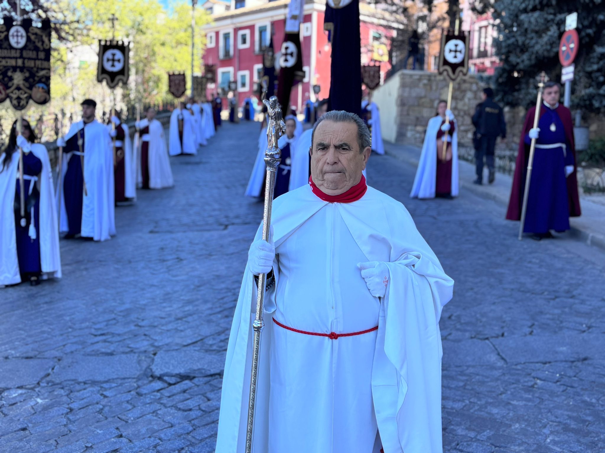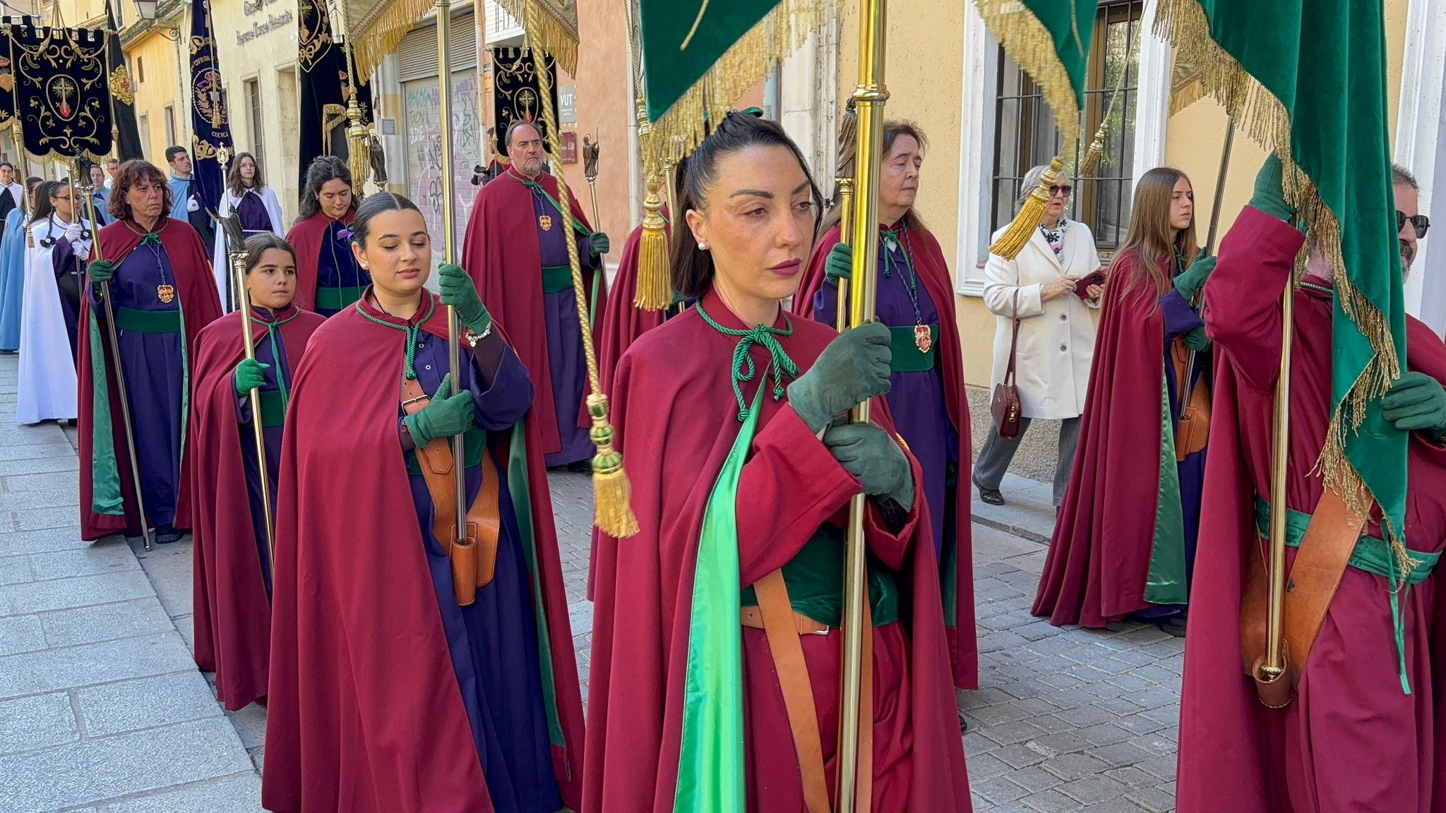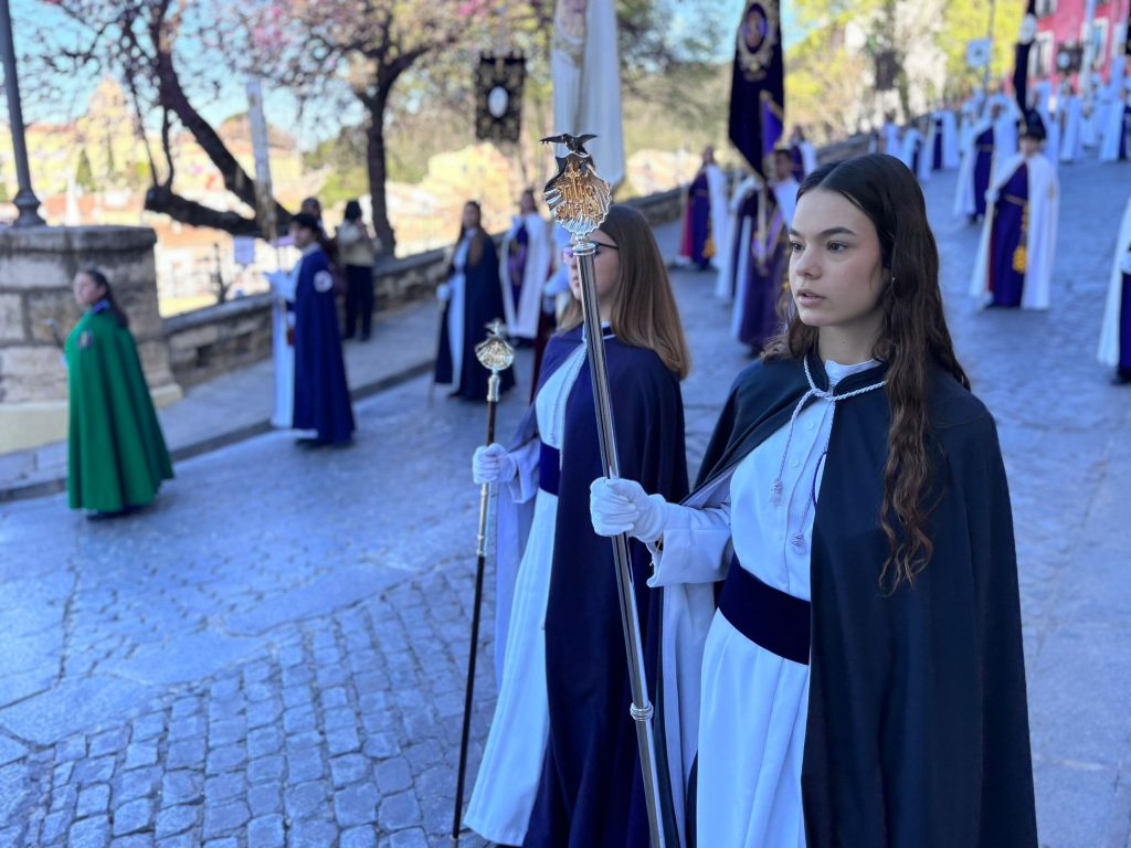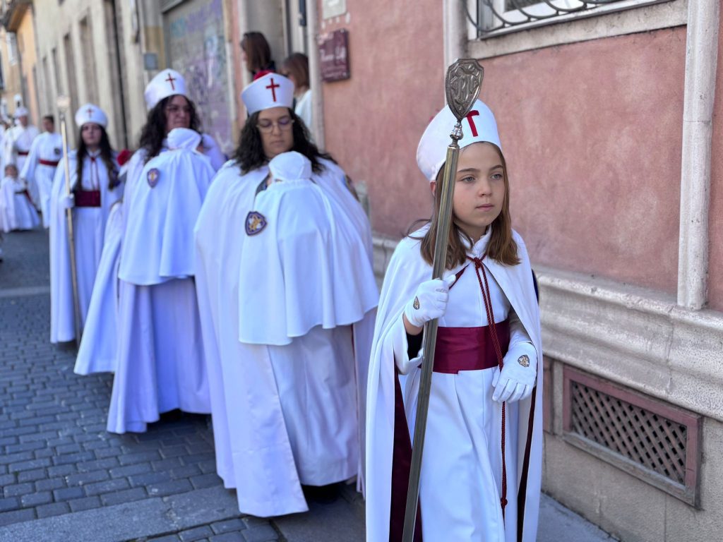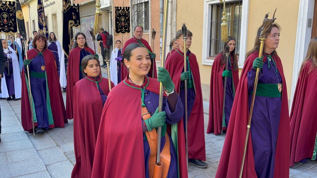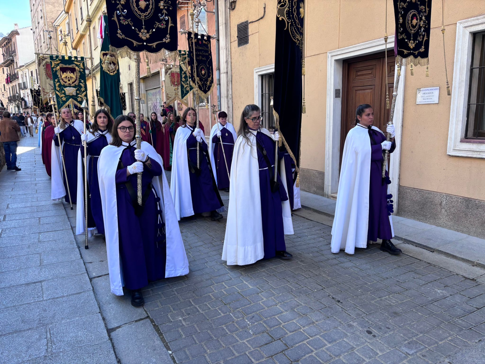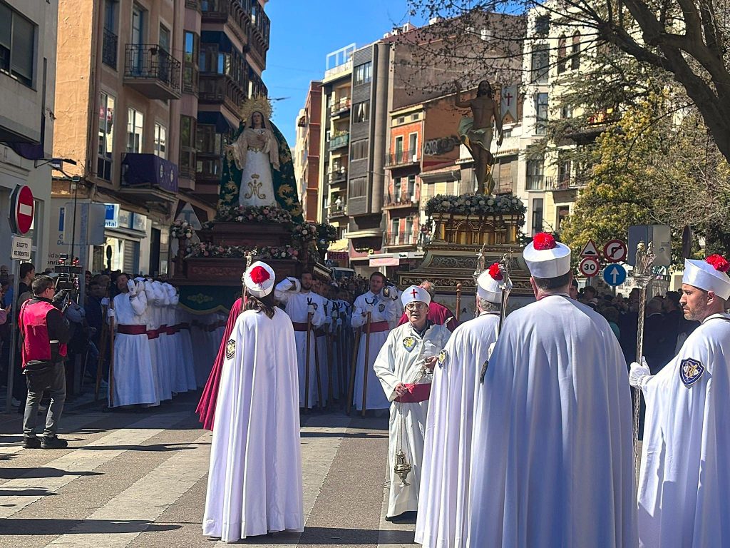 Las Sagradas Imágenes eligen caminos distintos. El Resucitado avanza por calles amplias para empaparse de la luz y el aire que echaba en falta en el sepulcro. Sigue la estela de color que forman los representantes de las hermandades de Cuenca, reunidas por este gran acontecimiento.
