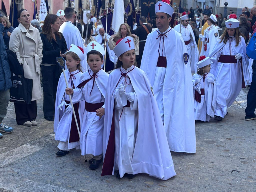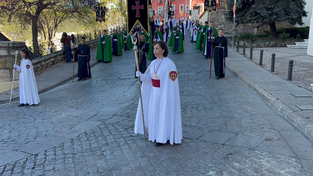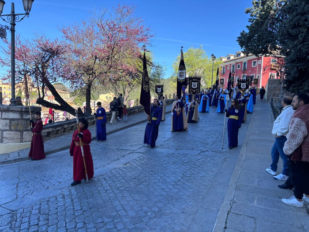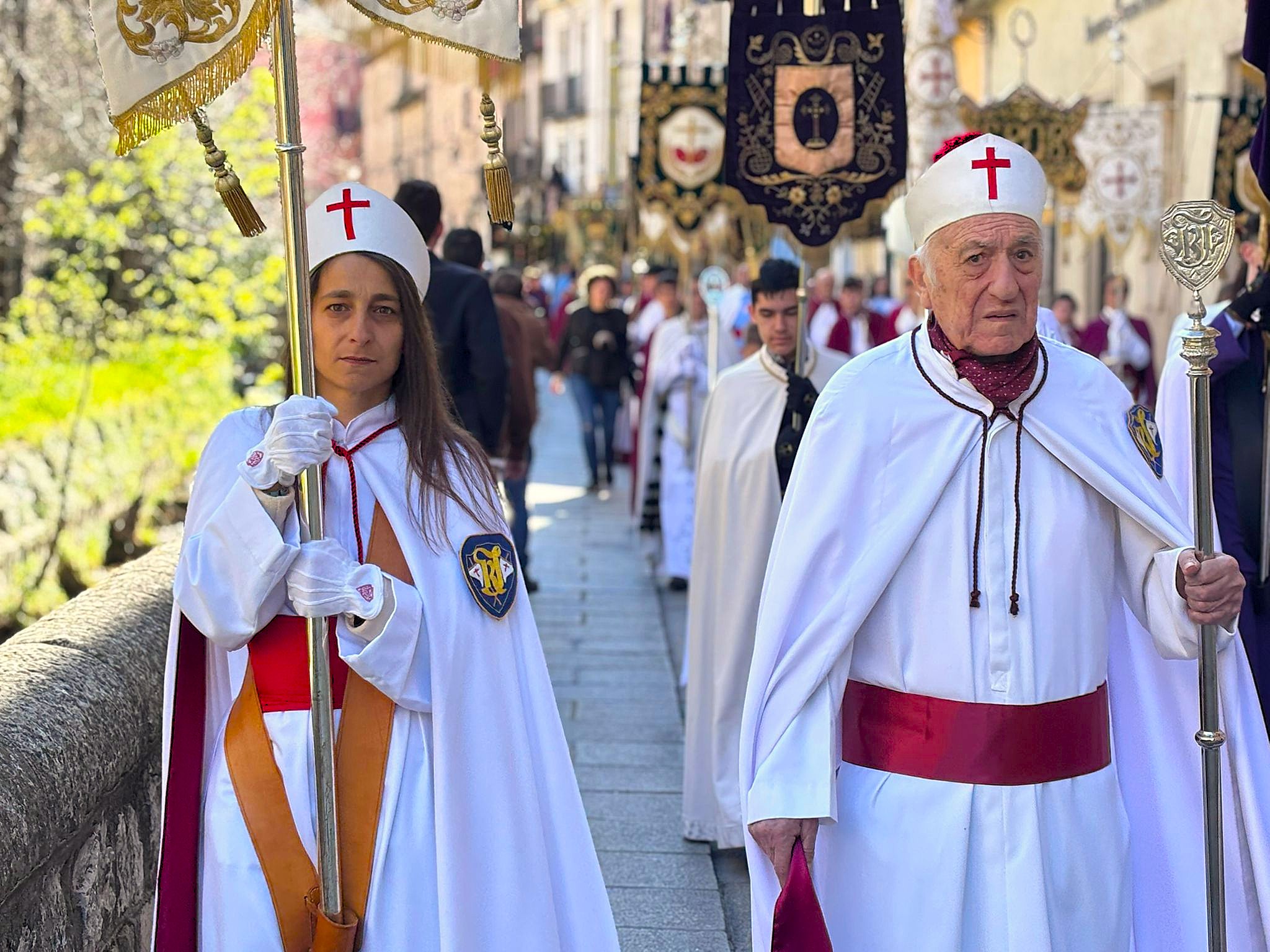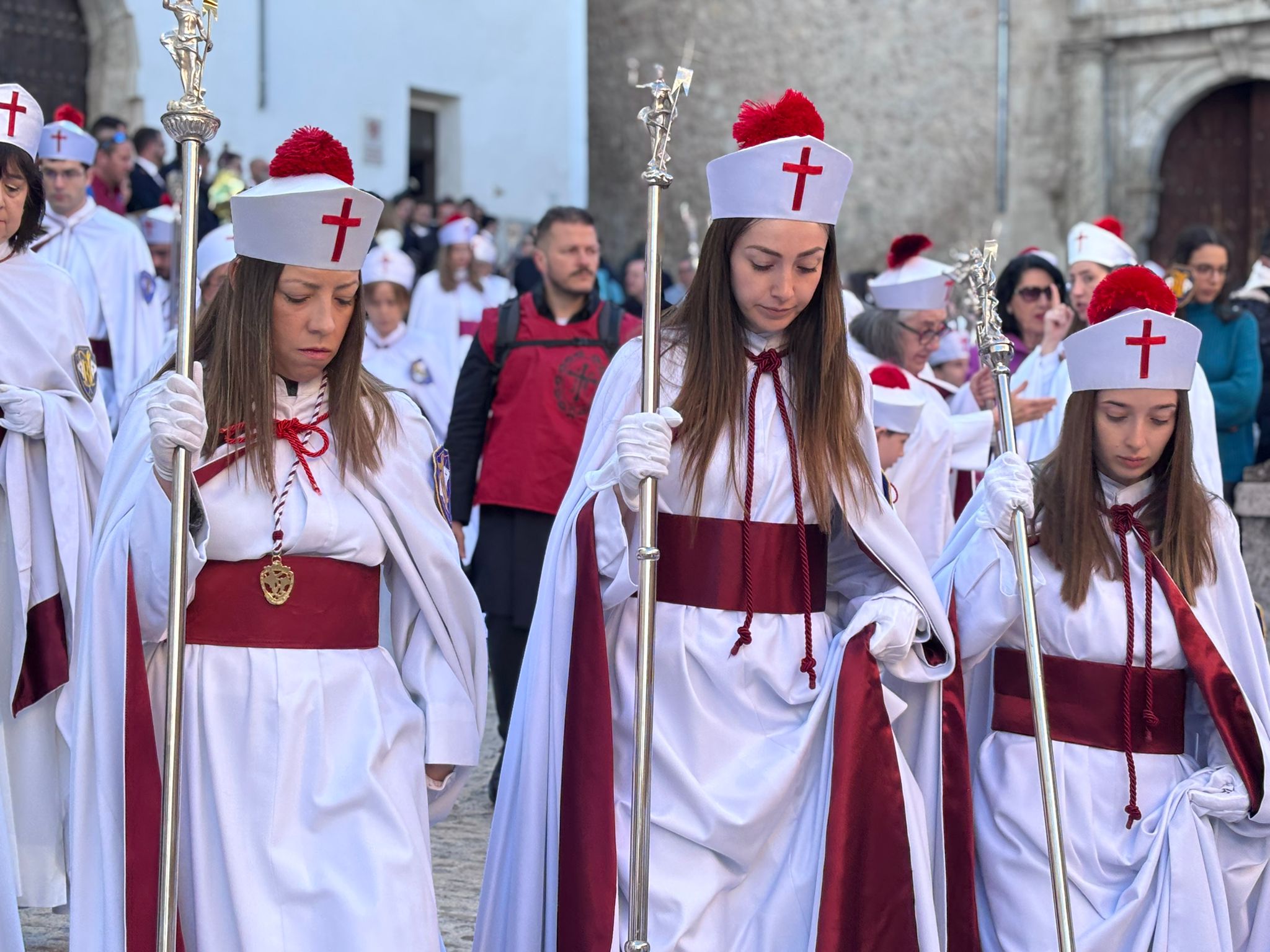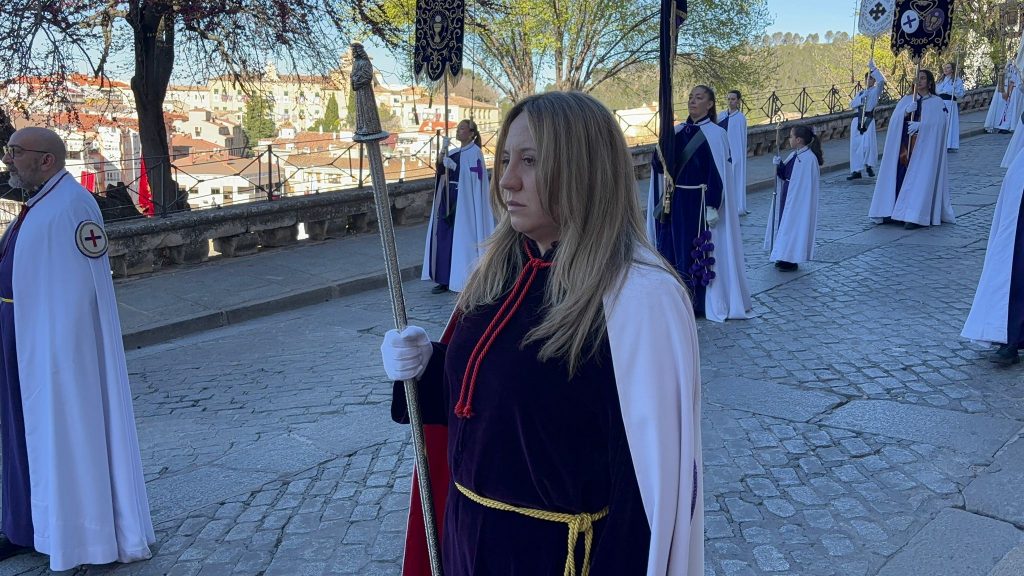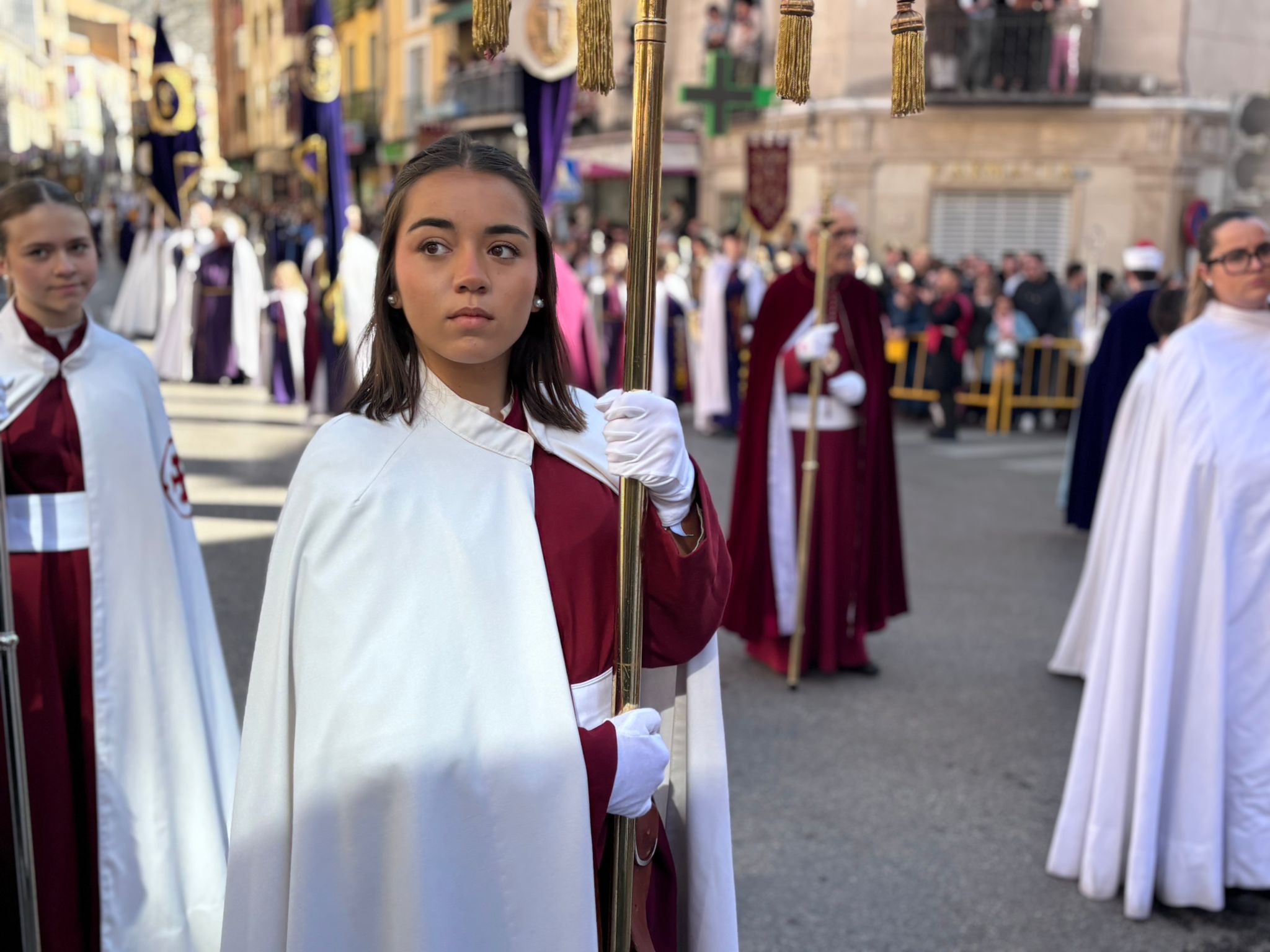 Las Sagradas Imágenes eligen caminos distintos. El Resucitado avanza por calles amplias para empaparse de la luz y el aire que echaba en falta en el sepulcro. Sigue la estela de color que forman los representantes de las hermandades de Cuenca, reunidas por este gran acontecimiento.