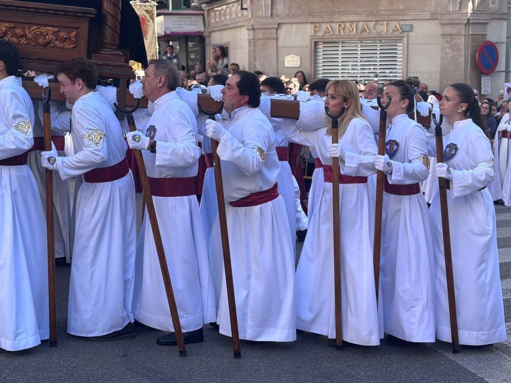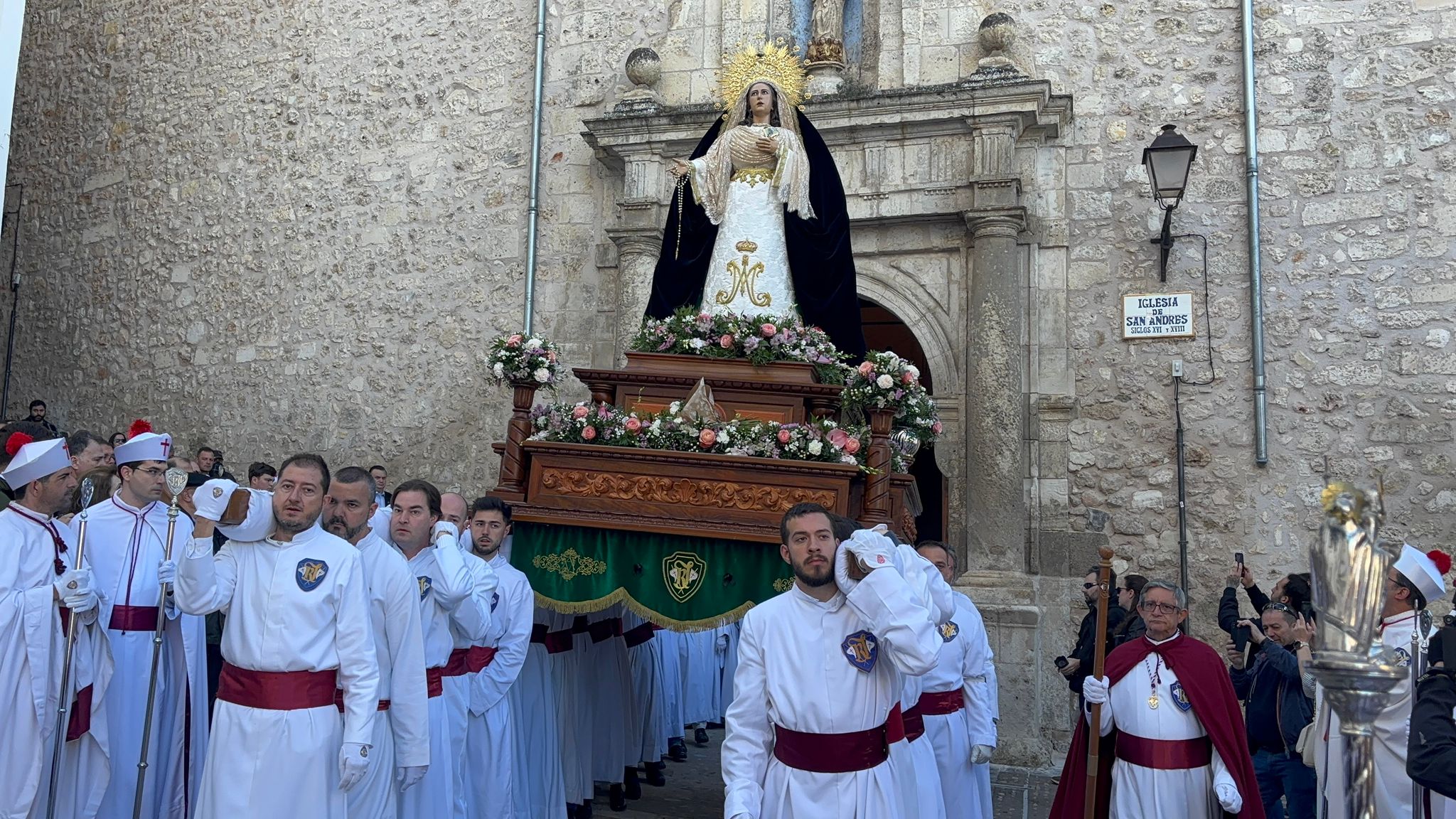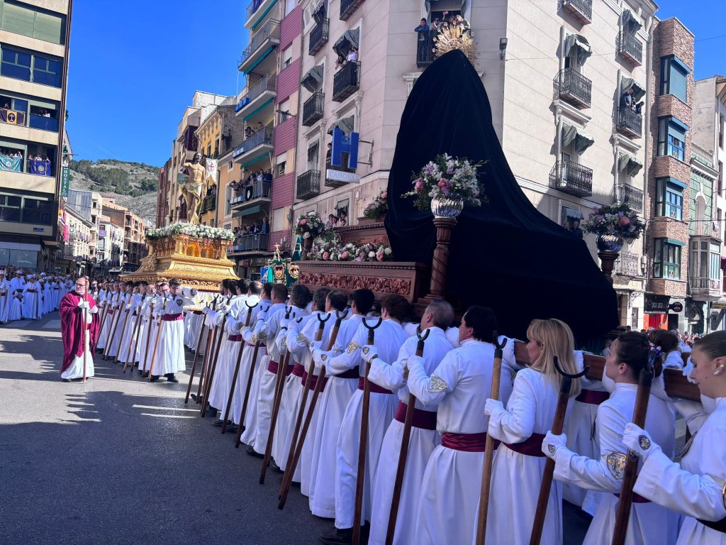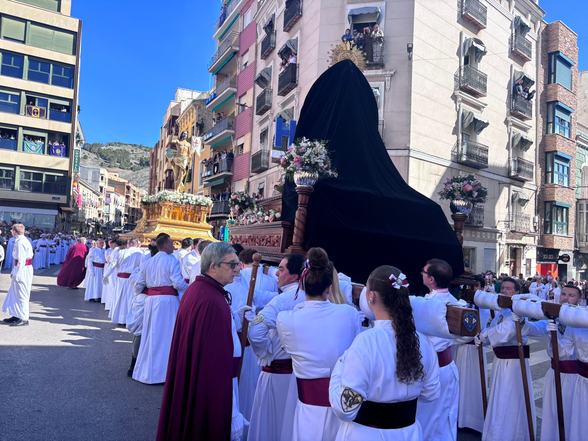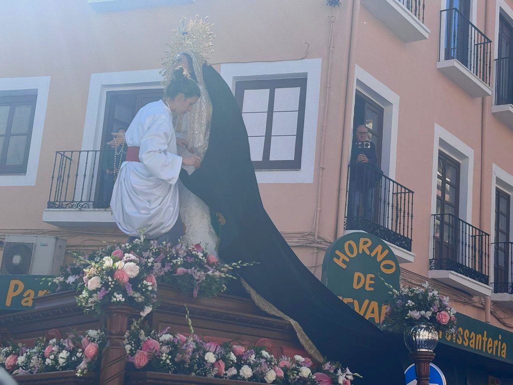 Después aparece la Virgen del Amparo que, todavía de luto, sale en busca de su hijo. Son muchas las banceras que llevan el peso de la Madre en esta procesión de El Encuentro.