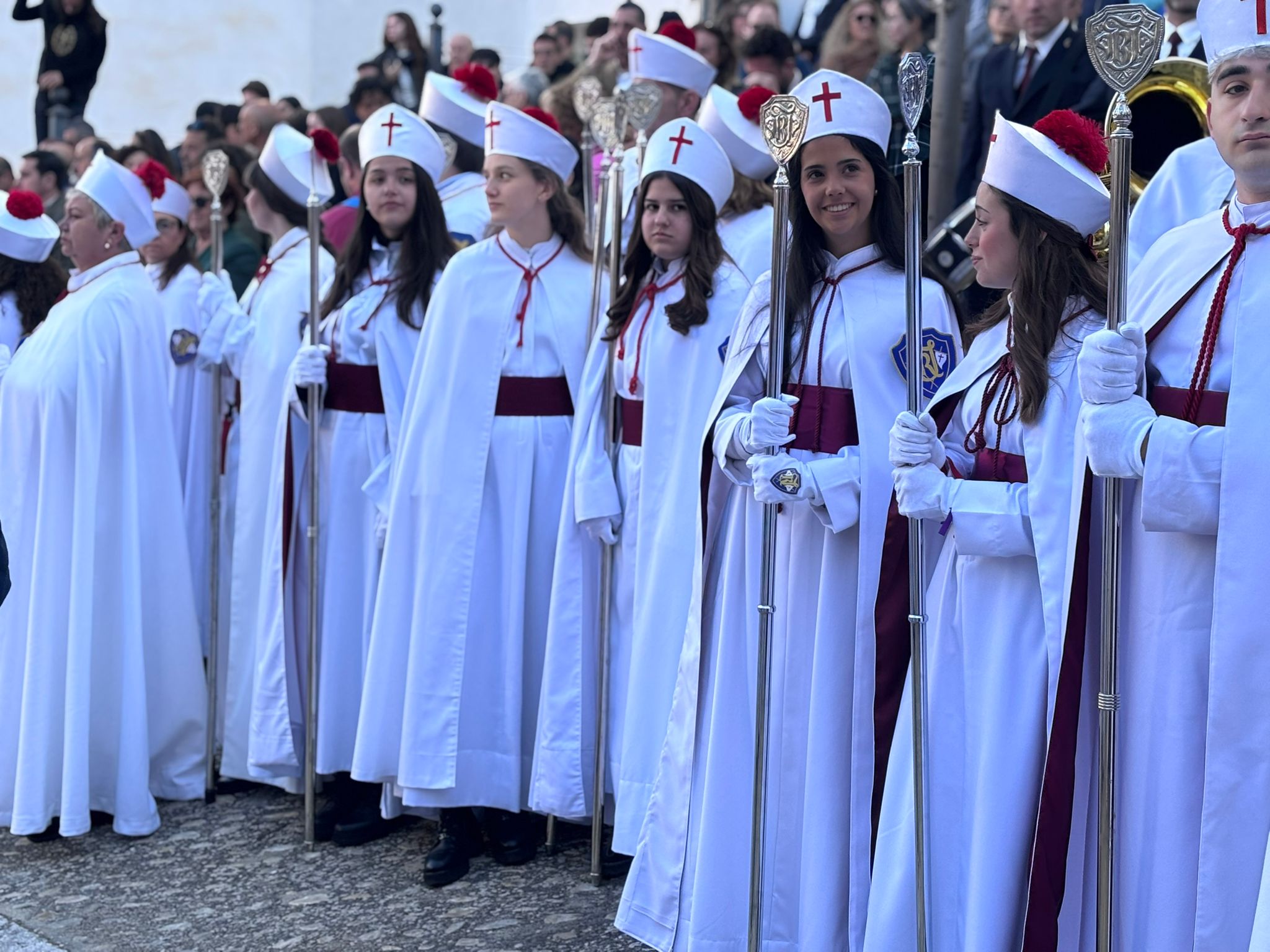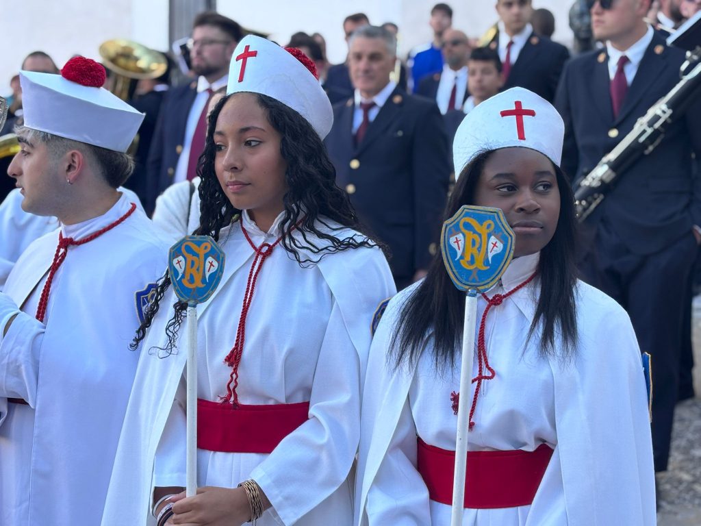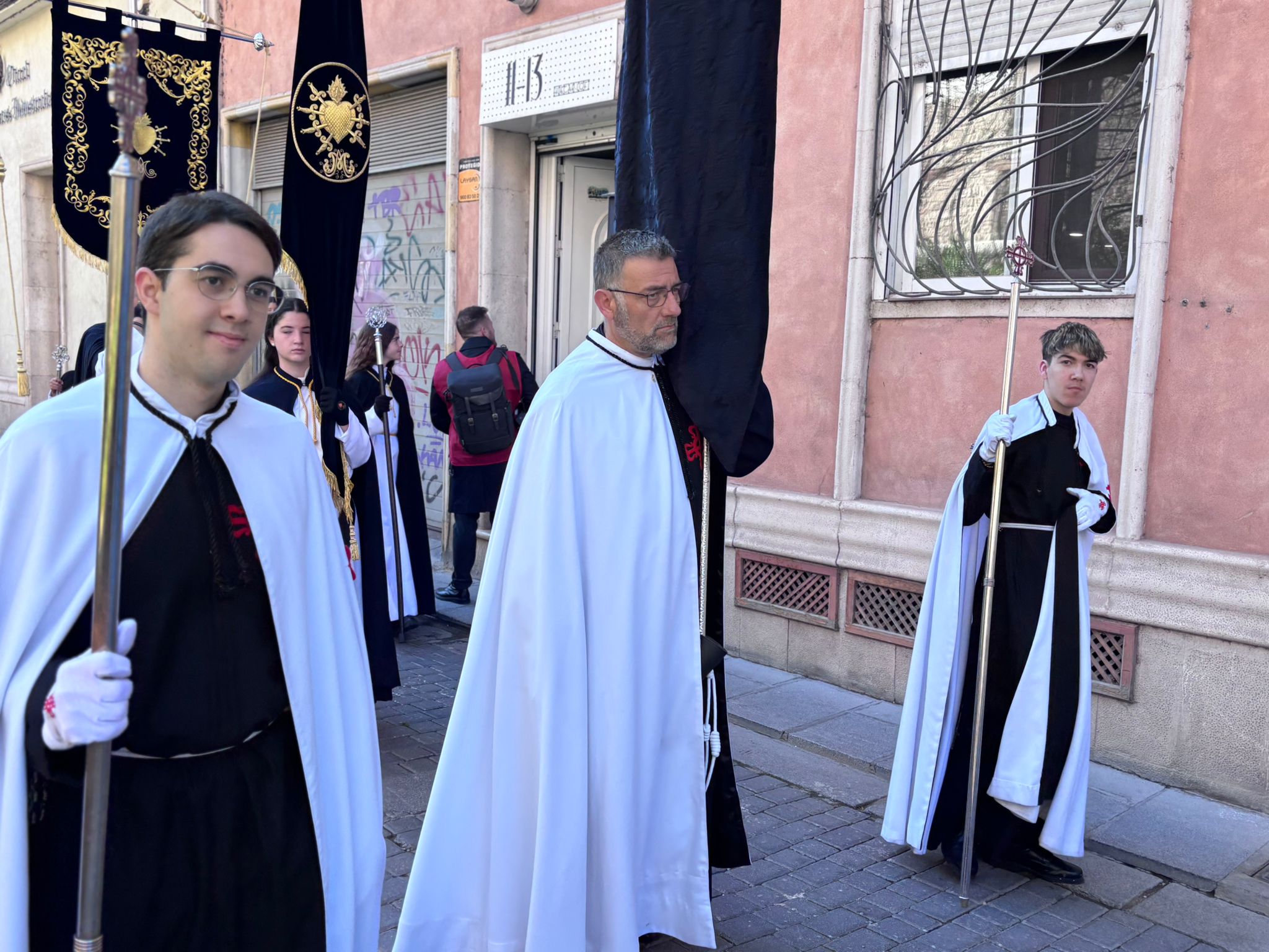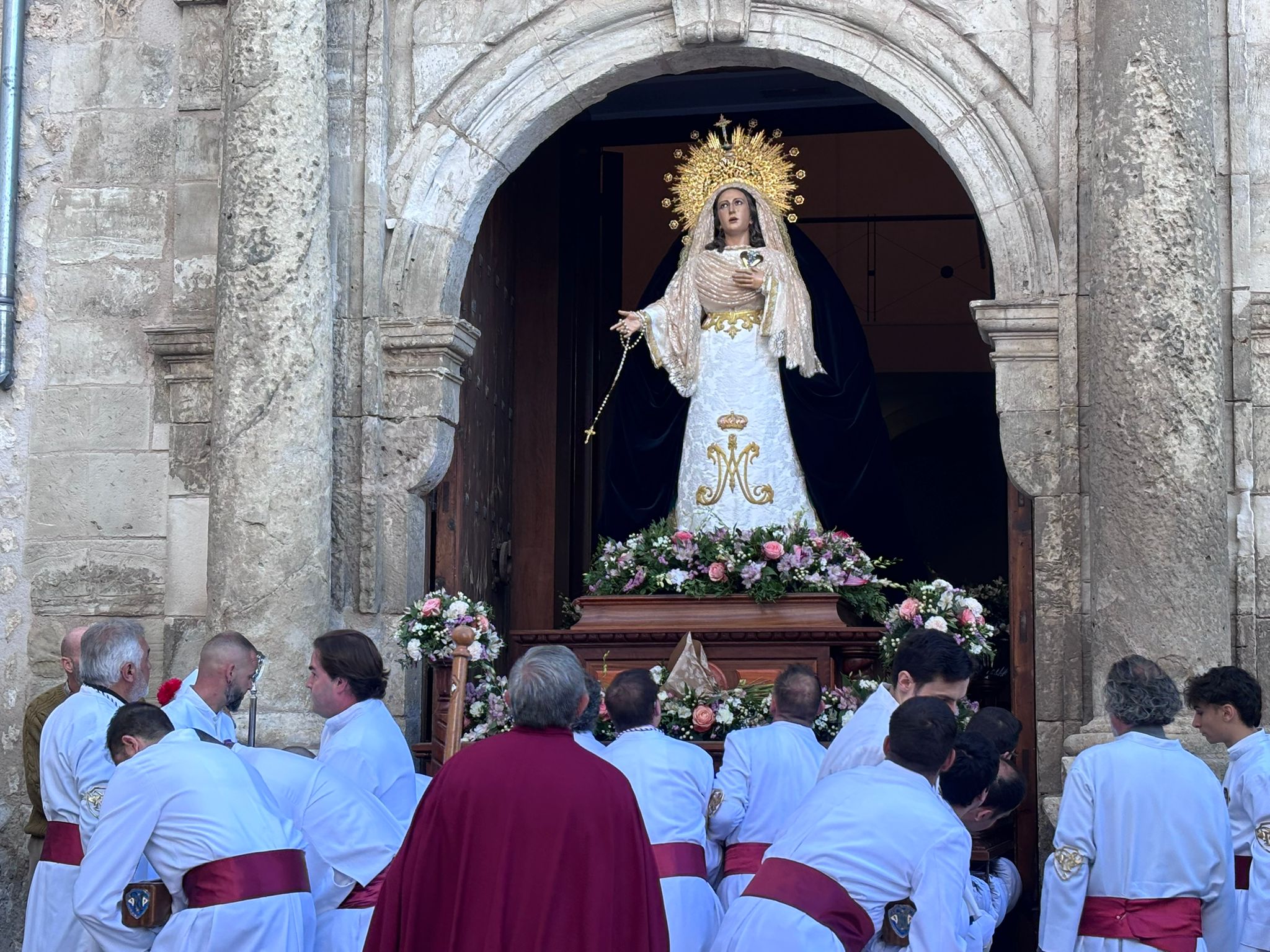 Después aparece la Virgen del Amparo que, todavía de luto, sale en busca de su hijo. Son muchas las banceras que llevan el peso de la Madre en esta procesión de El Encuentro.