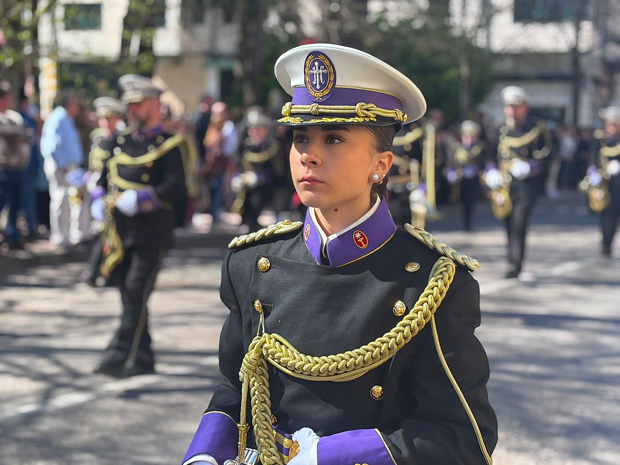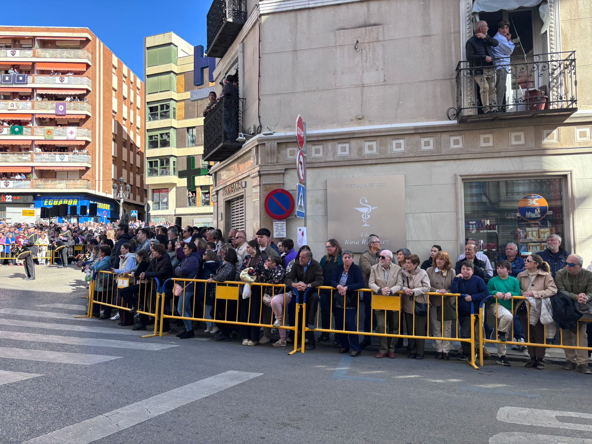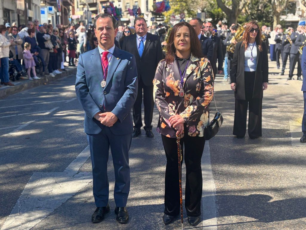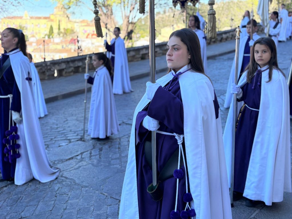 Después aparece la Virgen del Amparo que, todavía de luto, sale en busca de su hijo. Son muchas las banceras que llevan el peso de la Madre en esta procesión de El Encuentro.