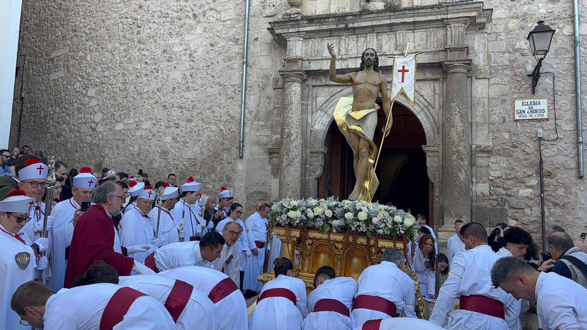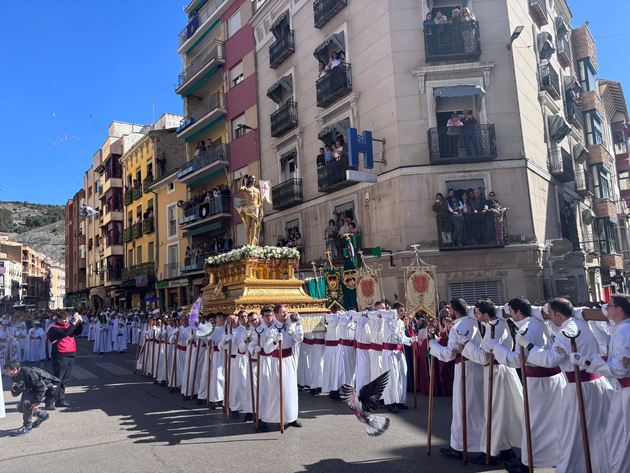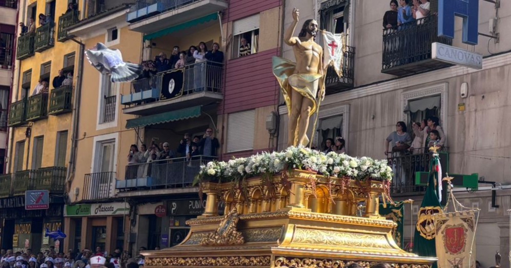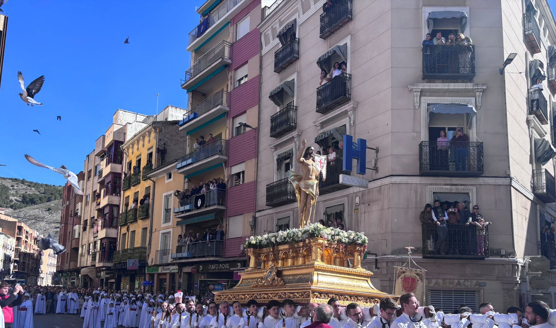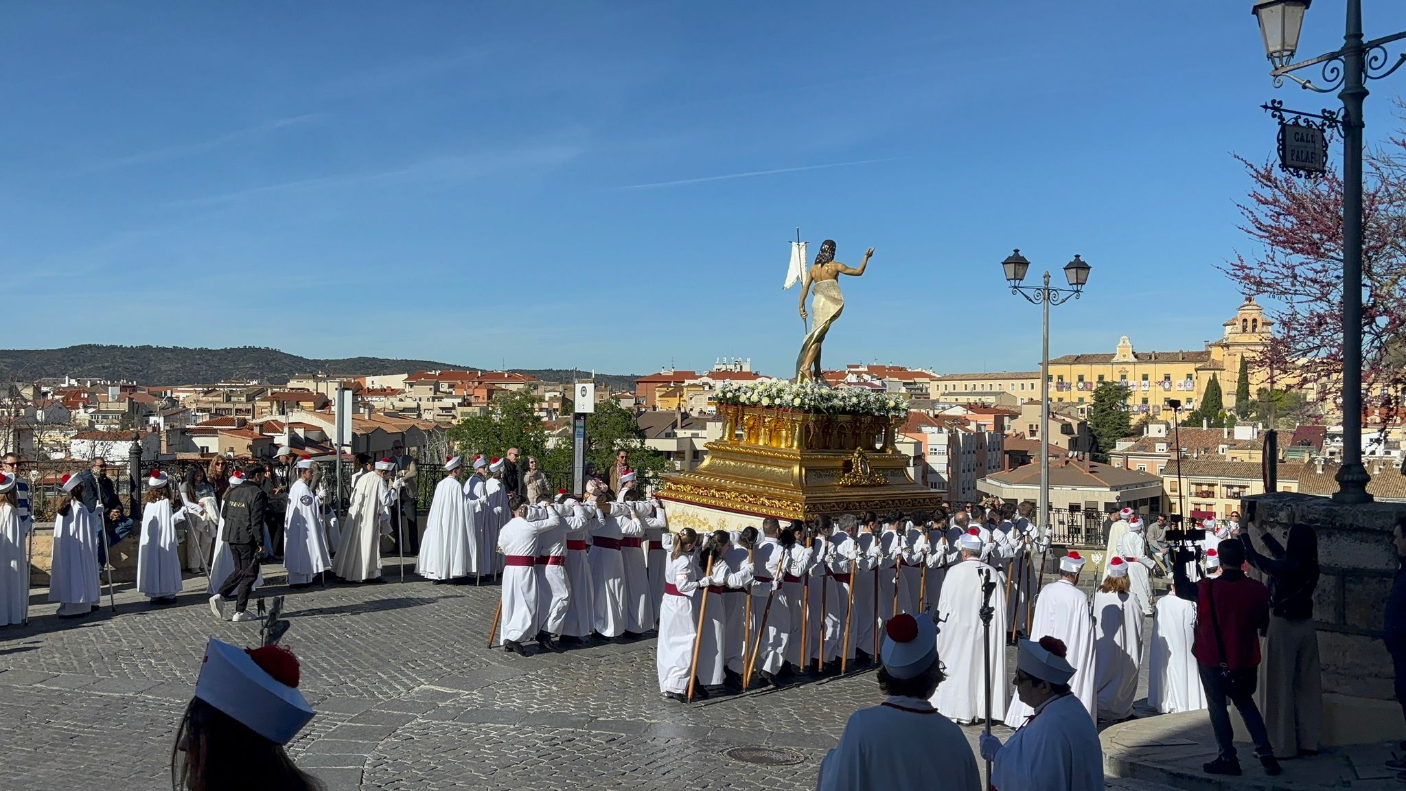 Pasadas las 10 de la mañana se abren las puertas y aparece El Resucitado. Sus banceros lo elevan para que comprobemos que lo que estamos viendo es cierto: el Cristo al que hemos visto sufrir y perecer estos días ha vuelto y quiere celebrarlo con la gente de Cuenca.