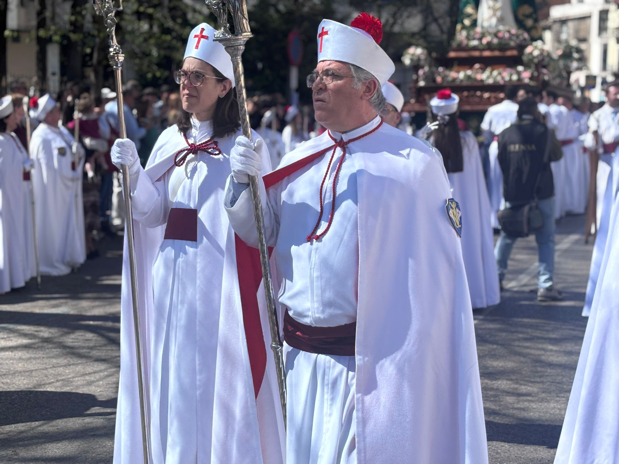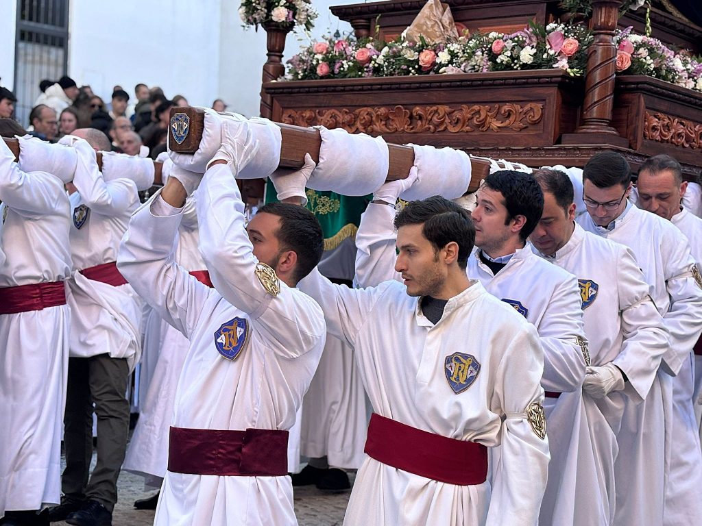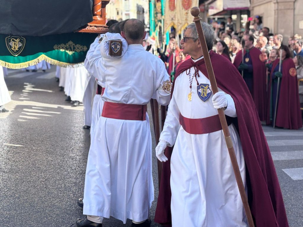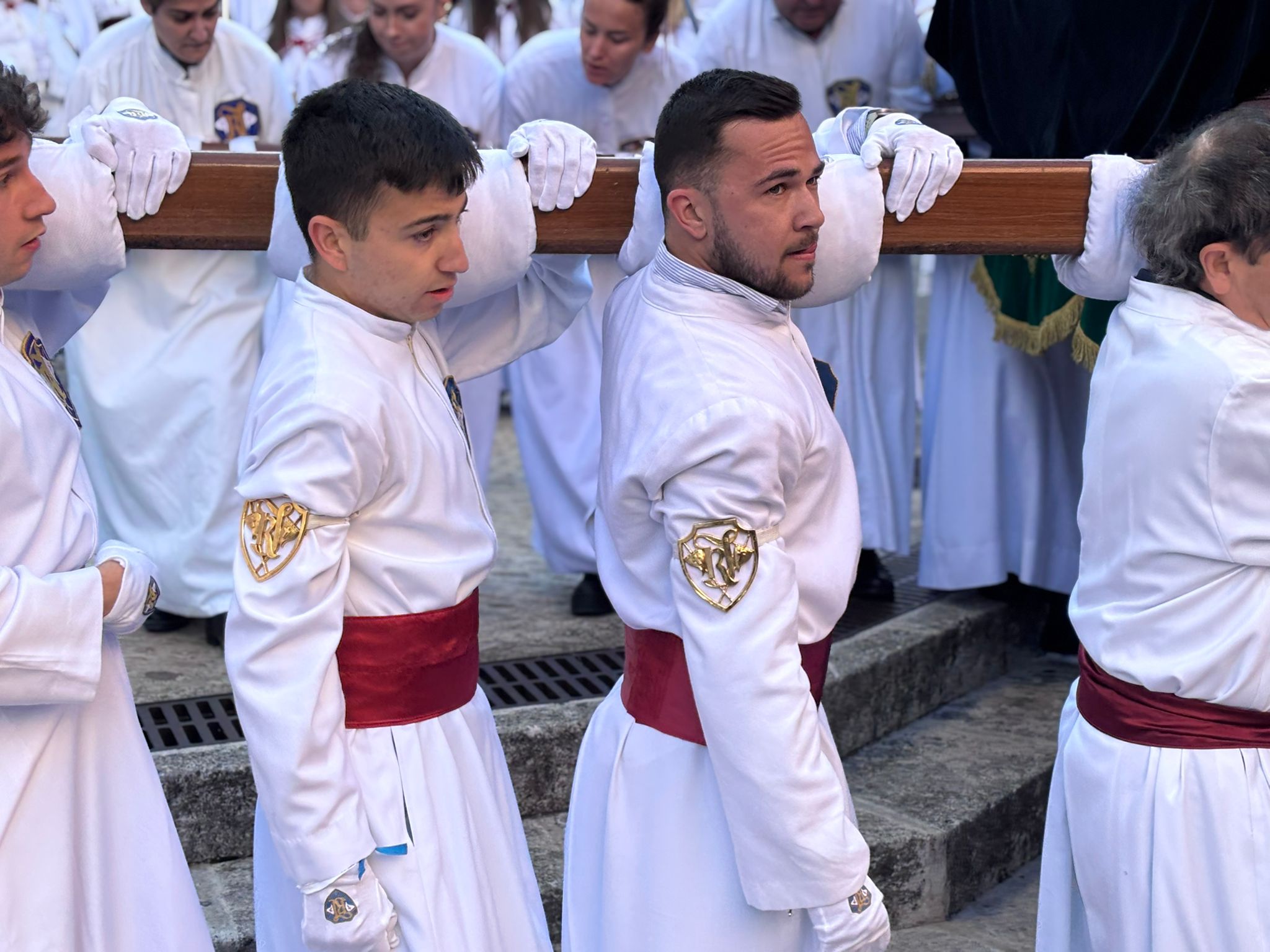 La procesión se reanuda con ambas imágenes unidas. Es un momento alegre, pero la felicidad no tiene por qué reñir con la memoria- Por eso los pasos recuerdan, con un crespón negro en las gualdrapas, a los nazarenos que hoy comparten esta dicha desde el cielo.