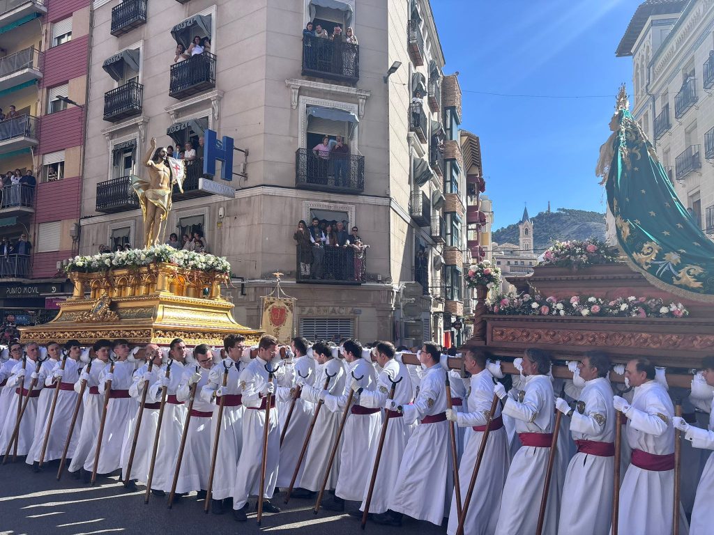 Tras este bello momento, las imágenes flotan y los banceros las llevan en volandas cuando la procesión de El Encuentro afronta la recta final del recorrido.
