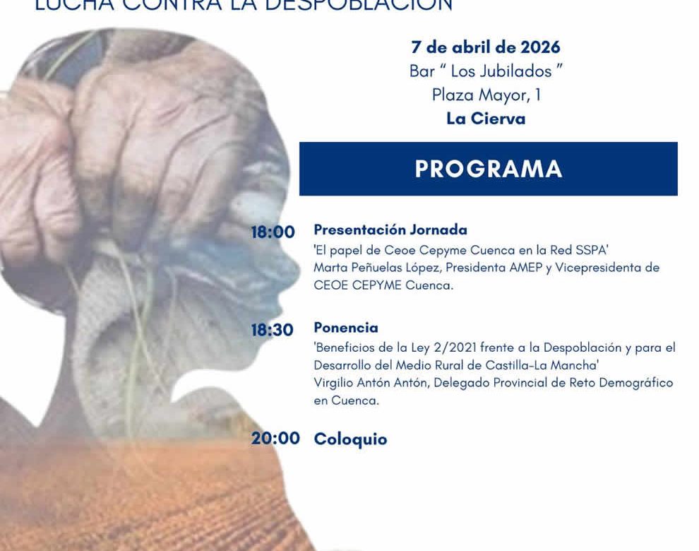La jornada se celebrará en el Bar Los Jubilados, ubicado en la Plaza Mayor de esta localidad, y está previsto que comience a las 18 horas con la ponencia de la presidenta de AMEP y vicepresidenta de CEOE CEPYME Cuenca, Marta Peñuelas que conversará sobre ‘El papel de la CEOE CEPYME Cuenca en la Red SSPA’ Posteriormente turno para el delegado provincial de Reto Demográfico de Castilla-La Mancha, Virgilio Antón, que va a exponer los ‘Beneficios de la Ley 2/2021 frente a la despoblación y para el Desarrollo del Medio Rural de Castilla-La Mancha’.