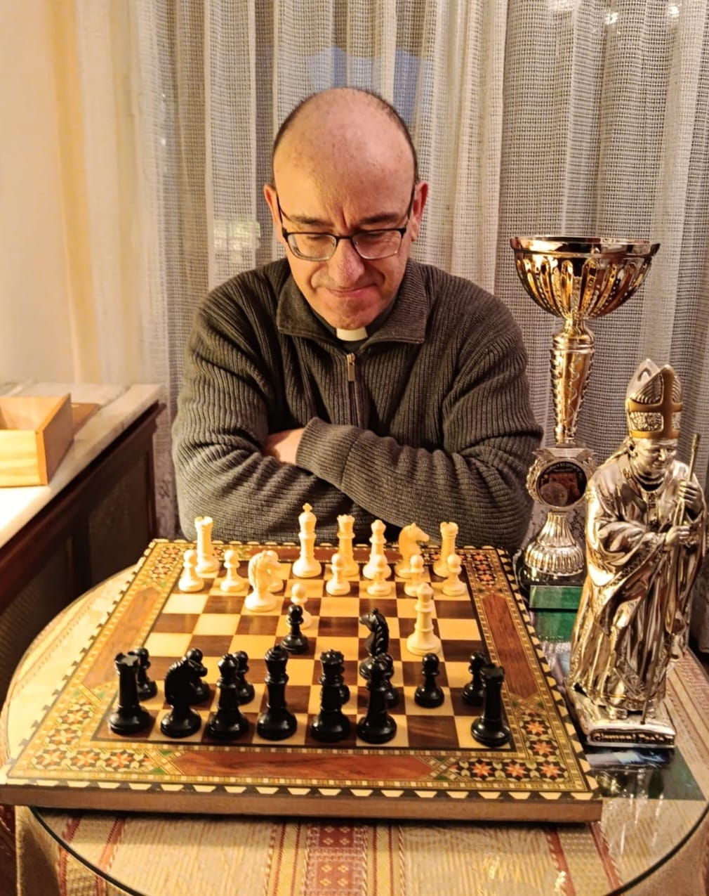 El deporte y la religión no son incompatibles. El Papa San Juan Pablo II, gran esquiador y deportista en general, destacaba los valores y virtudes humanos que fomenta todo deporte. Una afición como el ajedrez, en su justa medida, te puede ayudar a emplear sanamente el tiempo libre. Tratando de vivirla por supuesto con deportividad. Es verdad que en algunos momentos, sobre todo con los niños que jugué en el torneo San Silvestre, me daba pena comerles piezas y ganarles. Pero por encima de la rivalidad, el ajedrez, como todo deporte, puede crear lazos de amistad. Con el paso de los años, he forjado grandes amistades con algunos ajedrecistas de mi época. Y eso es muy bonito. Por eso, en las parroquias por donde he pasado, y actualmente en Católicos en Acción, donde soy consiliario, he tratado de fomentar el ajedrez entre los niños. Ayudado por supuesto por mis hermanos Jaime y Arturo —misionero en Argentina—, también aficionados y promotores del ajedrez entre la juventud.