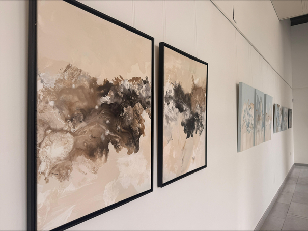 La muestra reúne un total de 22 obras en las que la autora presenta una propuesta de pintura abstracta basada en la sencillez visual, el equilibrio y la armonía. Sus trabajos, realizados principalmente con acrílico sobre lienzo y también sobre madera mediante técnica mixta, se caracterizan por el uso de una paleta de tonos suaves, con predominio de colores tierra, beige, negro y matices dorados.