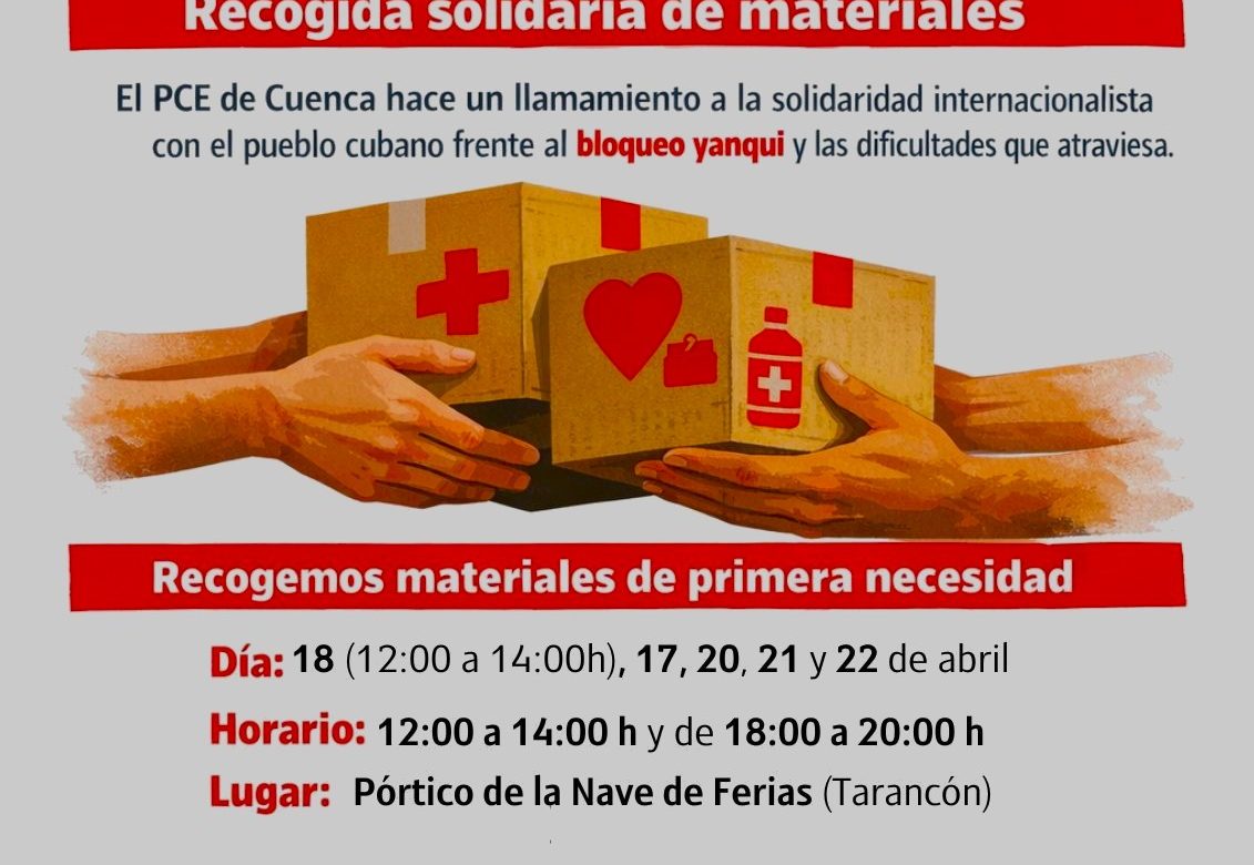 Tras las iniciativas ya realizadas por el núcleo del Partido Comunista en Cuenca capital, así como en las localidades de Las Mesas y Mota del Cuervo, la organización da continuidad a esta campaña con un nuevo punto de recogida en Tarancón, reforzando así su compromiso con el pueblo cubano ante las dificultades que atraviesa como consecuencia del bloqueo económico impuesto por Estados Unidos. A pesar de ello, destacan que la Revolución Cubana continúa resistiendo, defendiendo su soberanía, su independencia y los derechos sociales conquistados frente a las presiones del imperialismo.