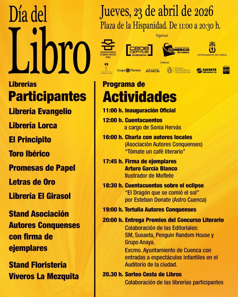 Los autores conquenses llegarán de nuevo al escenario a las 19 horas con una tertulia que dará paso una hora después a la entrega de premios del concurso literario en el que han colaborado las editoriales SM, Susaeta, Penguin Random House y Grupo Anaya, además del Ayuntamiento de Cuenca.