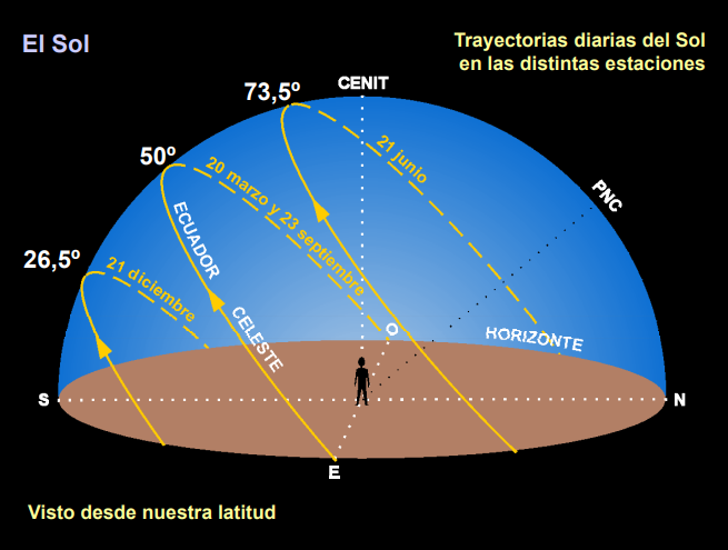 En su desplazamiento anual, el Sol se va moviendo sobre el horizonte recorriendo un arco de circunferencia, cuyo inicio está en su salida hacia el este y su puesta en el oeste. Si somos un poco observadores, vemos que los puntos de salida y puesta van variando a lo largo del año, y que sólo se produce la salida por el este los días muy cercanos al equinoccio de otoño y primavera y la puesta por el oeste en esas mismas fechas (siendo los dos momentos en que el Sol permanece exactamente 12 horas sobre el horizonte y 12 bajo el horizonte). El resto del movimiento, salida y puesta del Sol, se producen en una parte del horizonte que va desde el solsticio de invierno, en su salida hacia el sureste y su puesta al suroeste, recorriendo el arco más pequeño de circunferencia sobre el cielo, dando lugar al día más corto del año (durando el día unas 9 horas), al solsticio de verano, en el que el Sol sale por el noreste y se pone por el noroeste, recorriendo el arco más largo de circunferencia del año y por tanto el día más largo (el Sol, en nuestra latitud permanece más de 15 horas sobre el horizonte).