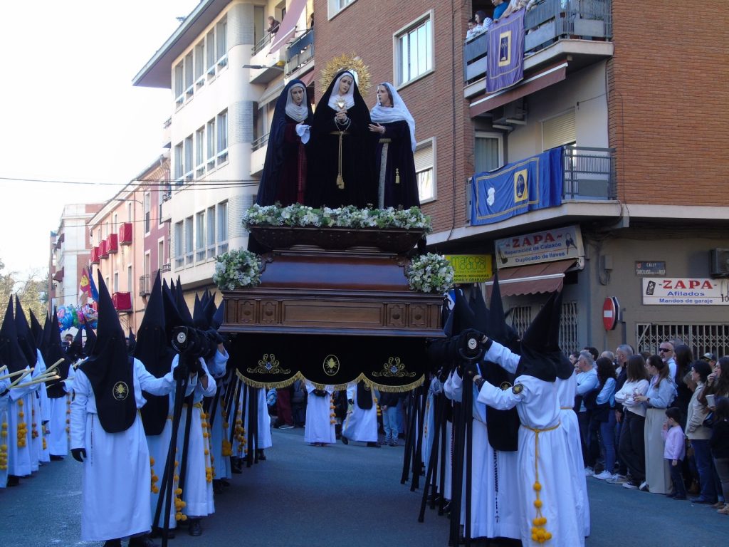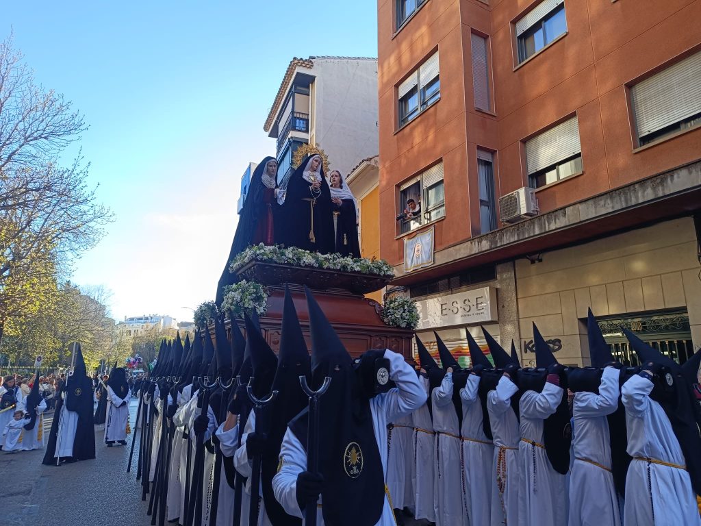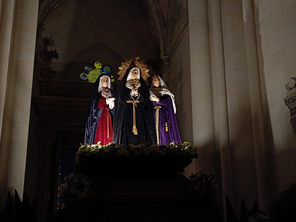 Nuestra Señora de los Dolores, arropada y acompañada de María Magdalena y María Salomé, avanzan lentamente en su ascenso hacia la Catedral.