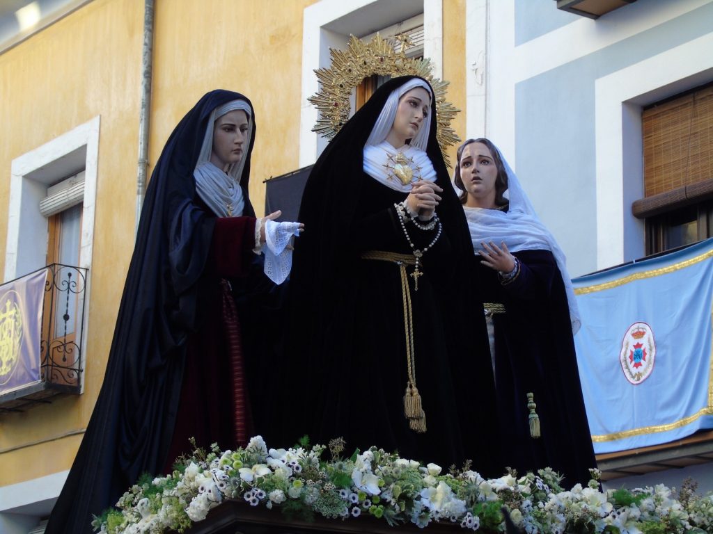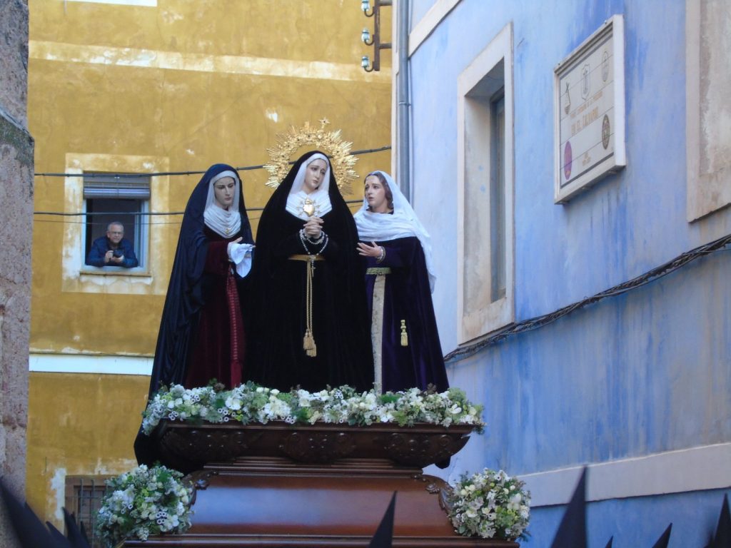 Cuando la imagen aparecía por los arcos del Ayuntamiento, la Plaza Mayor guardaba silencio, solo el leve sonido de los tambores marcaba el paso deNuestra Señora de los Dolores y las Santas Marías.